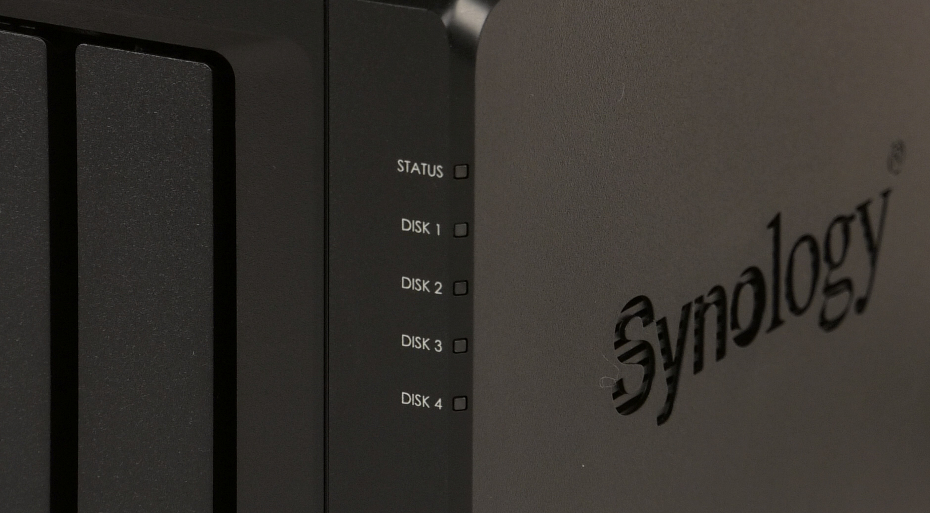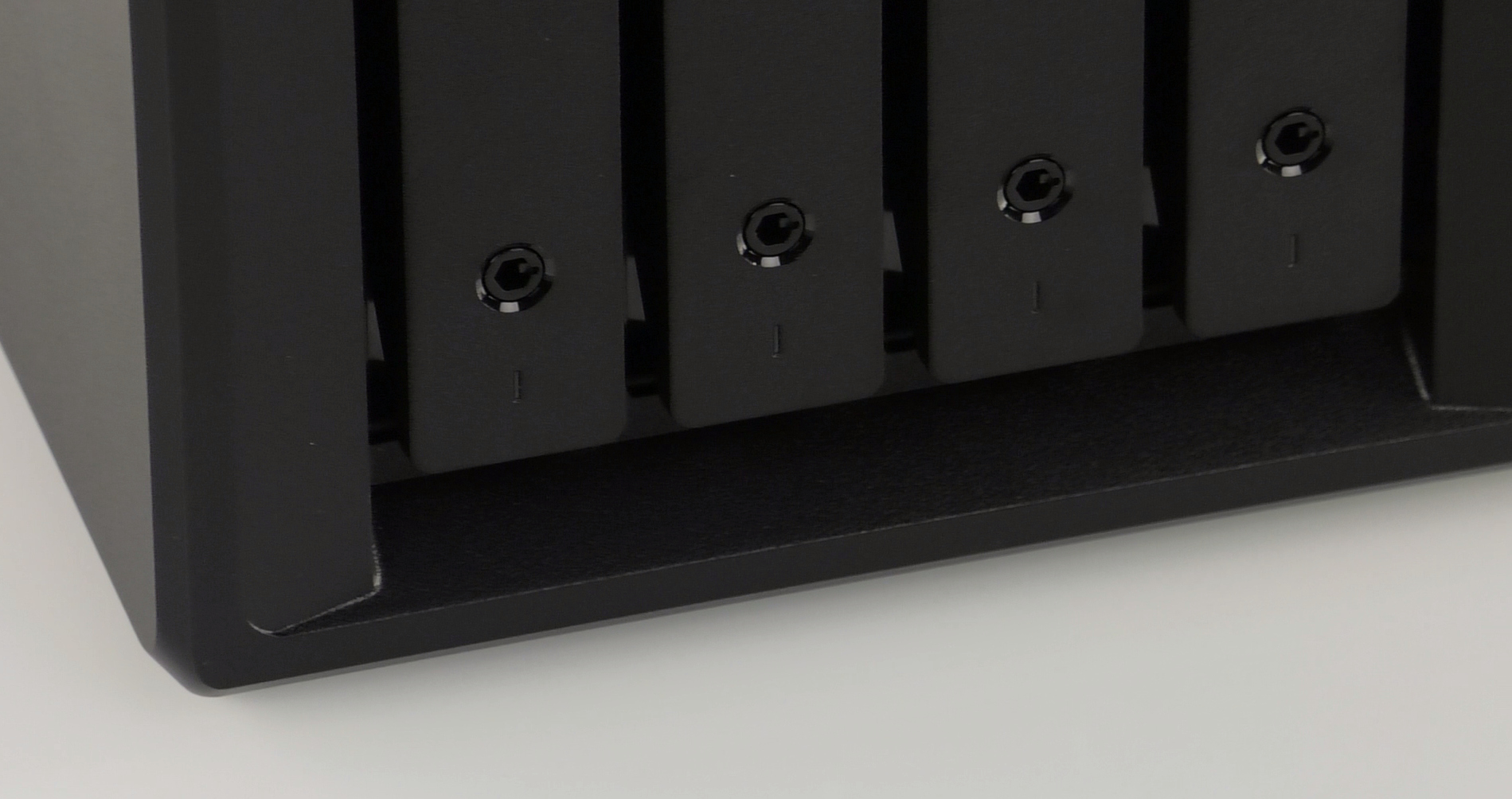 Вид передней панели напоминает выпущенные лет пять назад устройства. Бо́льшую ее часть занимают отсеки для дисков. Они ничем не закрыты, в отличие от устройств прошлого поколения, но на рамках предусмотрены дополнительные защелки. Через щели вокруг них внутрь корпуса поступает воздух для охлаждения. Жаль, что компания не реализовала какого-нибудь варианта защиты от пыли. Можно было бы предложить, например, сетку на быстросъемных магнитных креплениях. Даже если это немного портило внешний вид, пользы было бы немало.