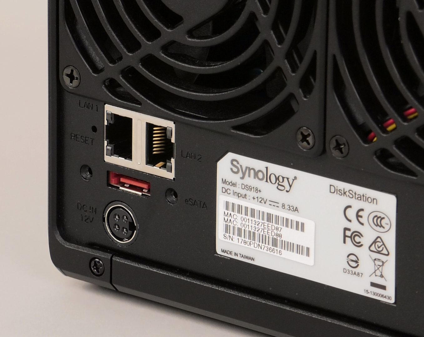 Сзади мы видим решетки двух вентиляторов формата 92 мм. В левой части установлены два порта гигабитной сети со встроенными индикаторами подключения и активности, скрытая кнопка сброса, порт eSATA с отверстиями для винтового крепления фирменного кабеля блока расширения и вход блока питания.