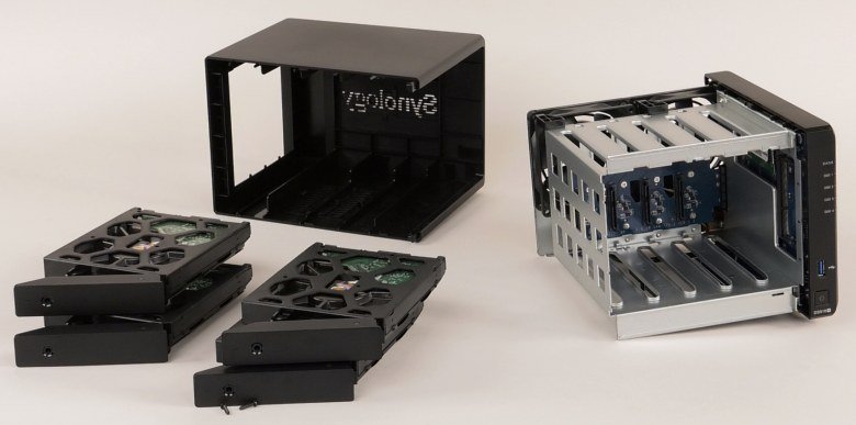 Что касается накопителей 2,5″, то их нужно будет прикрутить комплектными винтами к рамкам. Кстати, в списке совместимости уже есть диски на 12 ТБ, так что общий объем системы хранения данных может достигать внушительных 48 ТБ (108 ТБ с блоком расширения) или 36 ТБ (96 ТБ) в отказоустойчивой конфигурации.