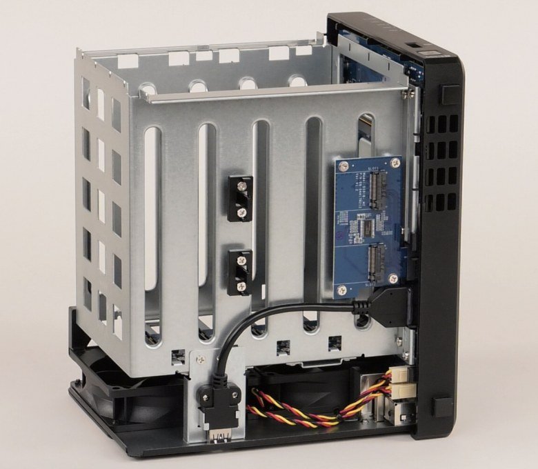 Кроме четырех штатных отсеков для жестких дисков, здесь предусмотрена возможность подключения внешнего модуля на пять винчестеров, что обуславливает цифру «9» в названии модели. Дополнительно сетевой накопитель оборудован двумя слотами M.2 для NVMe-накопителей формата 2280. Их можно использовать для создания обычных томов с данными, а можно применять для реализации схемы кэширования томов из традиционных жестких дисков. Сетевые контроллеры в данном устройстве представлены парой внешних чипов Intel, а порты USB 3.0 реализованы возможностями основной микросхемы SoC.