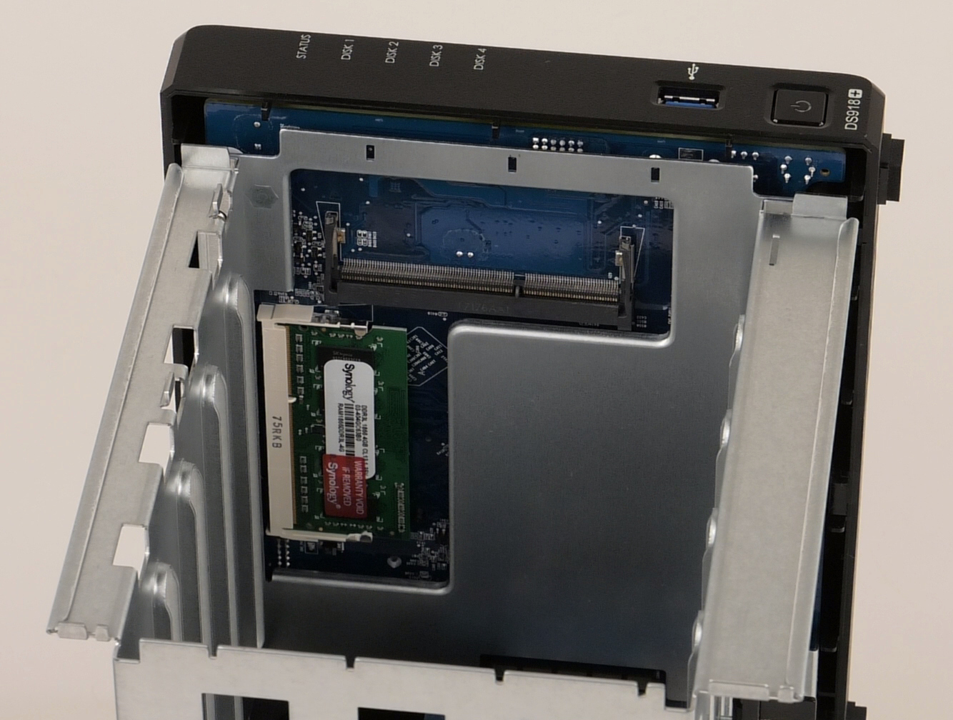 Сетевой накопитель работает на процессоре (точнее, SoC) Intel Celeron J3455. Эта модель была выпущена в прошлом году. Она имеет четыре вычислительных ядра, работающих на штатной частоте 1,5 ГГц с возможность увеличения ее до 2,3 ГГц. TDP чипа составляет 10 Вт, на нем установлен только небольшой радиатор. Базовый объем оперативной памяти в устройстве — 4 ГБ, его можно увеличить до 8 ГБ, установив еще один модуль DDR3L формата SODIMM.