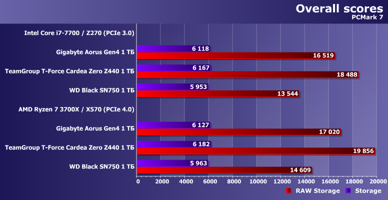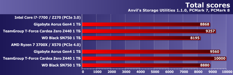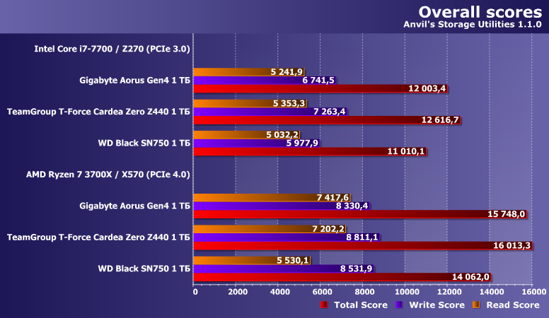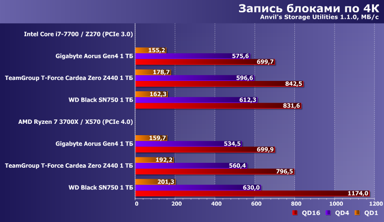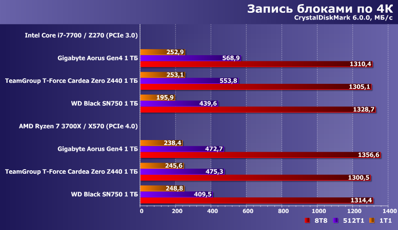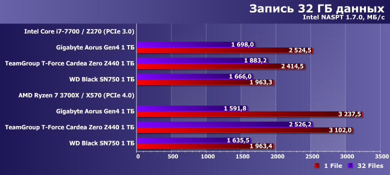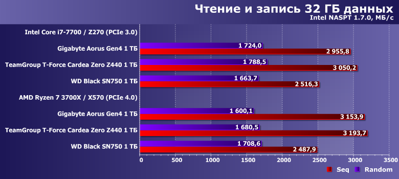 Впрочем, интересным оно пока является в применении к более массовым продуктам — с интерфейсом PCIe 3.0. Один такой накопитель, WD Black SN750 1 ТБ, мы в свое время протестировали и на платформе AMD AM4 с поддержкой PCIe 4.0, так что сегодня нам пригодятся «обе версии» его результатов. И, разумеется, возьмем Gigabyte Aorus NVMe Gen4 SSD 1 ТБ — тоже в двух позициях.