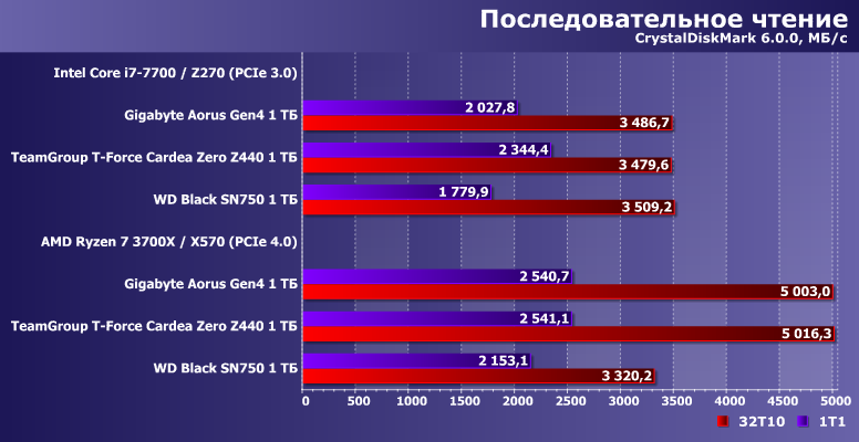 В большинстве тестов Gigabyte Aorus NVMe Gen4 SSD и TeamGroup T-Force Cardea Zero Z440 вели себя одинаково, но кое-где обновленная прошивка немного изменила скоростные показатели — в целом в сторону увеличения. А вот сравнивать результаты низкоуровневых бенчмарков на разных системах нужно очень осторожно: практически в той же степени от перехода на Ryzen ускорился и WD Black SN750, который, напомним, в любом случае поддерживает только PCIe 3.0, не более. По сути получаем, что «старые» Ryzen для выжимания максимума из SSD подходили хуже Core, зато «новые» — в целом даже лучше. И связано это не только с самим по себе интерфейсом.