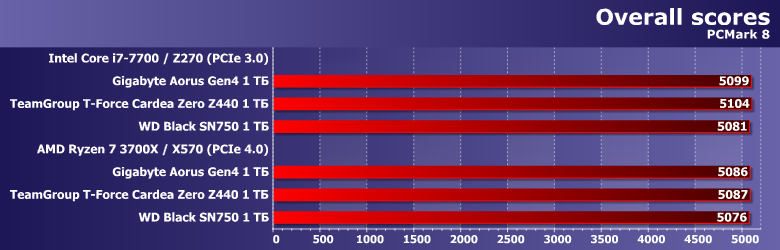 Поэтому и общий рейтинг «валить» в одну кучу не стоит — он зависит от платформы. А в одинаковых условиях получается очень интересная арифметика: что на «древней версии» LGA1151, что на последней модификации AM4 — Cardea Zero Z440 быстрее Black SN750 той же емкости примерно на 13%. И там, и там — практически одинаково. Более быстрый интерфейс в первом приближении практически никак не сказывается. Понятно, что во многом это зависит от того, какие типы операций преобладают в подсчетах, но результат все равно показательный.