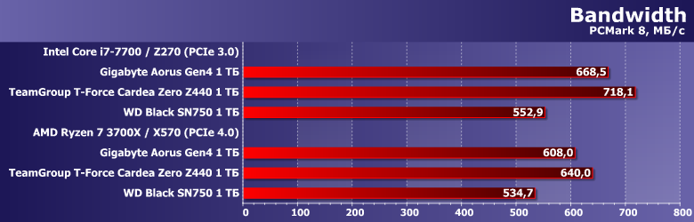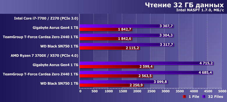 И здесь не без прироста скорости — хотя абсолютные значения по-прежнему оказываются ниже, чем пропускная способность PCIe 3.0 x4.