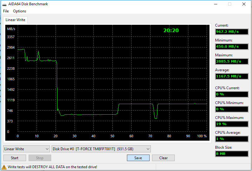 К тому же, в ряде случаев производительность определяется вовсе не интерфейсом. Верно это даже для последовательных операций: «полную скорость» накопители на базе TLC-памяти развивают только в пределах SLC-кэша, а вот сам массив флэша принимает данные куда медленнее. Впрочем, несложно убедиться, что особых проблем это не доставляет: максимальная скорость, как обычно, достижима лишь на первых 4% емкости (таков как раз размер «чистого» кэша), более 200 ГБ «улетело» на скорости в 2500+ МБ/с (на PCIe 4.0 получилось бы и больше 3000), а почти половину времени накопитель писал данные со скоростью около 1000 МБ/с. Главное, что режим «прямой записи» вообще реализован — что видно по отсутствию характерной в ином случае «пилы» на графике. Учитывая, что многие «старые» модели даже на MLC-памяти такого не умели (работая стабильно, но медленнее), да и в практических сценариях быстрая запись сразу десятков (тем более — сотен) гигабайт крайне редка (мягко выражаясь), понятно, что никаких претензий к современным SSD среднего и высокого уровня на терабайте-другом TLC-памяти предъявлять не стоит. Болеть голова по данному поводу должна разве что при необходимости приобрести что-нибудь бюджетное и/или маленькое.