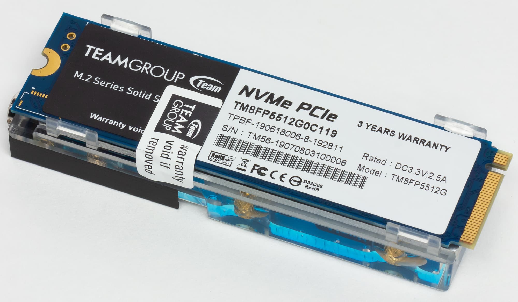 Заметим, что в игровой серии T-Force есть и практически идентичная по характеристикам линейка устройств с «классическими» радиаторами — Cardea II M.2 PCIe SSD. Случайны их совпадения или нет — пока гарантировать не можем. А вот что утверждать можем — так это идентичность самой платы «более народным» Team MP34, в чем несложно убедиться, сняв «водоблок» (при этом, понятно, «пострадает» гарантийная наклейка). Таким образом, все дальнейшее повествование можно считать относящимся и к ней. Да и к другим недорогим моделям на Phison E12 — тоже: Team использует немного удешевленную модификацию дизайна, отличающуюся небольшим количеством «низкочастотной» DRAM. В частности, накопители на 512 ГБ снабжаются всего одной микросхемой DDR3L-1866 Nanya, емкостью 256 МБ. Для сравнения — основанные на том же контроллере Gigabyte Aorus RGB M.2 NVMe SSD аналогичной емкости комплектуются 512 МБ DDR4-2400 SDRAM от Hynix, т. е. и более быстрой, и емкость вдвое больше. Аналогичную конфигурацию имеют также использующие «старший» референсный дизайн SSD Patriot, Seagate, Silicon Power и многие другие. Но TeamGroup к ним не относится — причем как в плане «обычных», так и формально «геймерских» SSD.