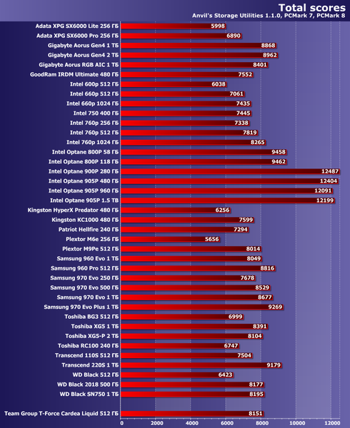 А если добавить и результаты тестов высокого уровня, так накопитель сразу же оказывается ближе к топовым моделям на базе флэш-памяти (Optane — все-таки отдельная история), причем даже если не выходить за пределы класса NVMe-устройств. В чем, впрочем, изначально сомнений не было — все-таки Phison E12 это современный высокопроизводительный контроллер, а не что-то простенькое бюджетное, да и сама флэш-память тут такая же, как и в других моделях на нем же.