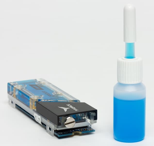 По утверждениям компании, суть запатентованной технологии «самоохлаждения» заключается в передаче тепла от компонентов в теплоотвод и далее — в охлаждающую жидкость для быстрого снижения температуры. После чего, как и в случае обычных радиаторов, в действие вступают потоки воздуха внутри корпуса компьютера. Почему нельзя просто воспользоваться обычным радиатором? А тогда сложно привлекать к продукту внимание — сейчас какие-никакие металлические пластины для улучшения теплоотвода от слотов M.2 стали штатными принадлежностями для розничных системных плат среднего и высокого уровня. Конкурировать (хотя бы) с ними специалисты компании не планируют: даже при анонсе речь шла всего лишь о «более стабильной работе системы по сравнению с твердотельными накопителями без радиаторов». Учитывая, что какая-то полезность таковых независимо от конструкции обычно наблюдается в лучшем случае при синтетических нагрузках (во всяком случае, это верно для Phison E12 — слишком уж высоким тепловыделением не отличающегося)... ну вы поняли.