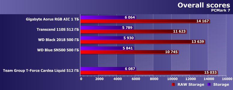 Как уже не раз было сказано, такие тесты — лучшее, что может случиться в жизни бюджетных SSD, поскольку реальные запросы прикладного ПО пока еще отстают от их возможностей. Правда искать в таких условиях аргументы в пользу покупки NVMe-накопителя очень сложно, но если недорогого — отчего бы и нет? А тут интересным является то, что из всех пяти участников один из самых недорогих — еще и самый быстрый. Что, впрочем, не так уж неожиданного: размер и частота DRAM вряд ли могут сказаться на результатах, а вот большой SLC-кэш — вполне. При том, что в PCMark вообще устройства на базе Phison E12/E16 на фоне прочих смотрятся очень хорошо, фактически нашему главному герою приходится «сражаться» разве что с Aorus — а у него и это получается.