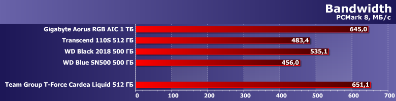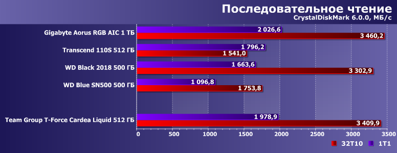 Такая ценовая политика делает интересным сравнение как раз с первыми. Например, WD Blue SN500 500 ГБ — работать должен медленнее, зато пять лет гарантии (пусть и с более серьезными ограничениями). И Transcend 110S емкостью 512 ГБ мы тоже тестировали ранее, а он может при некоторых типах нагрузки нашего главного героя даже обогнать. Но заведомо должен сделать это Aorus RGB AIC емкостью 1 ТБ, который мы тоже возьмем в качестве ориентира для оценки сверху: понятнее будет, чего мы на деле лишаемся (если лишаемся) при меньшей емкости как самого устройства, так и DRAM-буфера. Поразмыслив, мы решили для такой же «оценки сверху» взять и WD Black 2018 500 ГБ. Четырех хорошо знакомых многим устройств будет, как нам кажется, вполне достаточно.