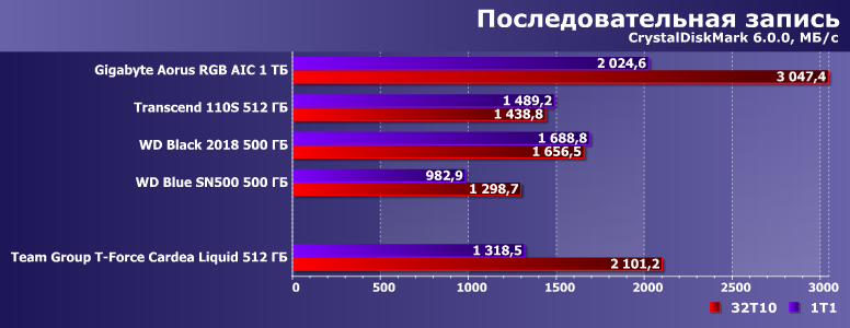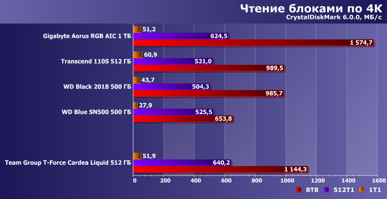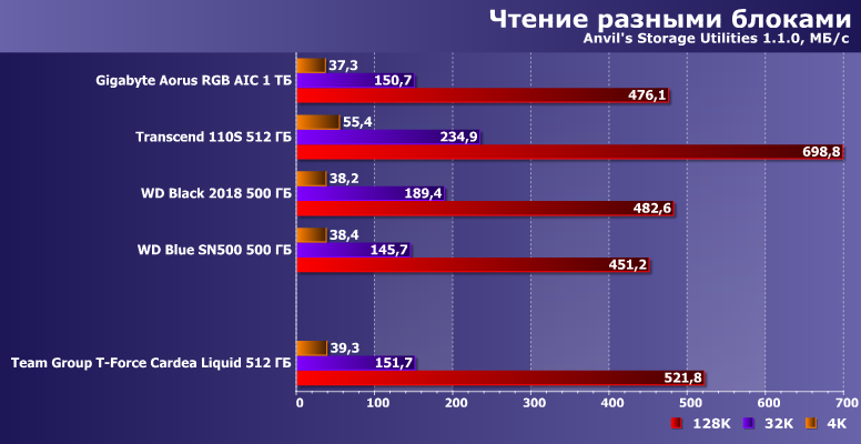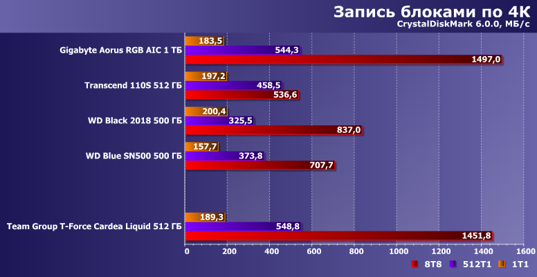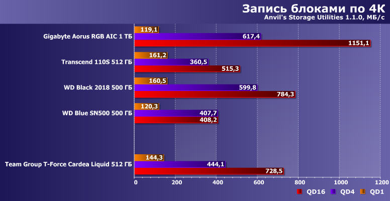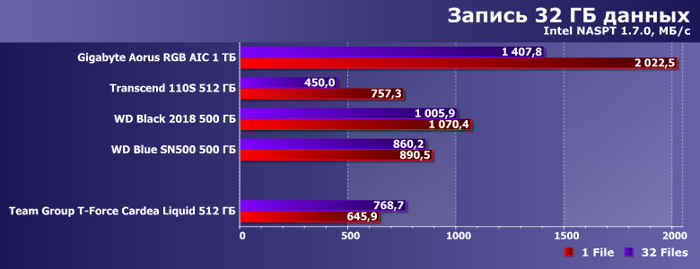 Как уже не раз было отмечено, логика работы современных контроллеров Phison и Silicon Motion идеально «подогнана» к тестам низкого уровня, что делает основанные на них накопители потенциальными фаворитами. Всегда — если не помешают другие факторы: например, в Transcend используются довольно медленные чипы памяти, WD Blue ограничен интерфейсом и т. п. Ну а Cardea Liquid (впрочем, как и Cardea II или совсем недорогой МР34 — аппаратно-то они одинаковые) ничего не мешает быть лучшим в своем классе. Но в своем — понятно, что большее количество кристаллов памяти в терабайтном Aorus сразу же делает его недостижимым на операциях записи.