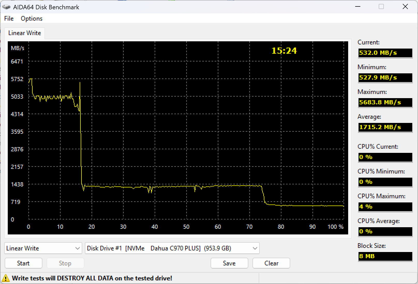 Проявляется это иногда и в такой простой дисциплине, как полная пропись данными. Общие принципы, впрочем, не меняются и хорошо видны на графике. Максимальная скорость записи — в пределах статической части SLC-кэша, далее динамика в размере половины или трети свободных ячеек (конкретный размер настраивает производитель), переход на режим прямой записи во флэш, расчистка кэша.