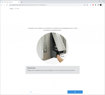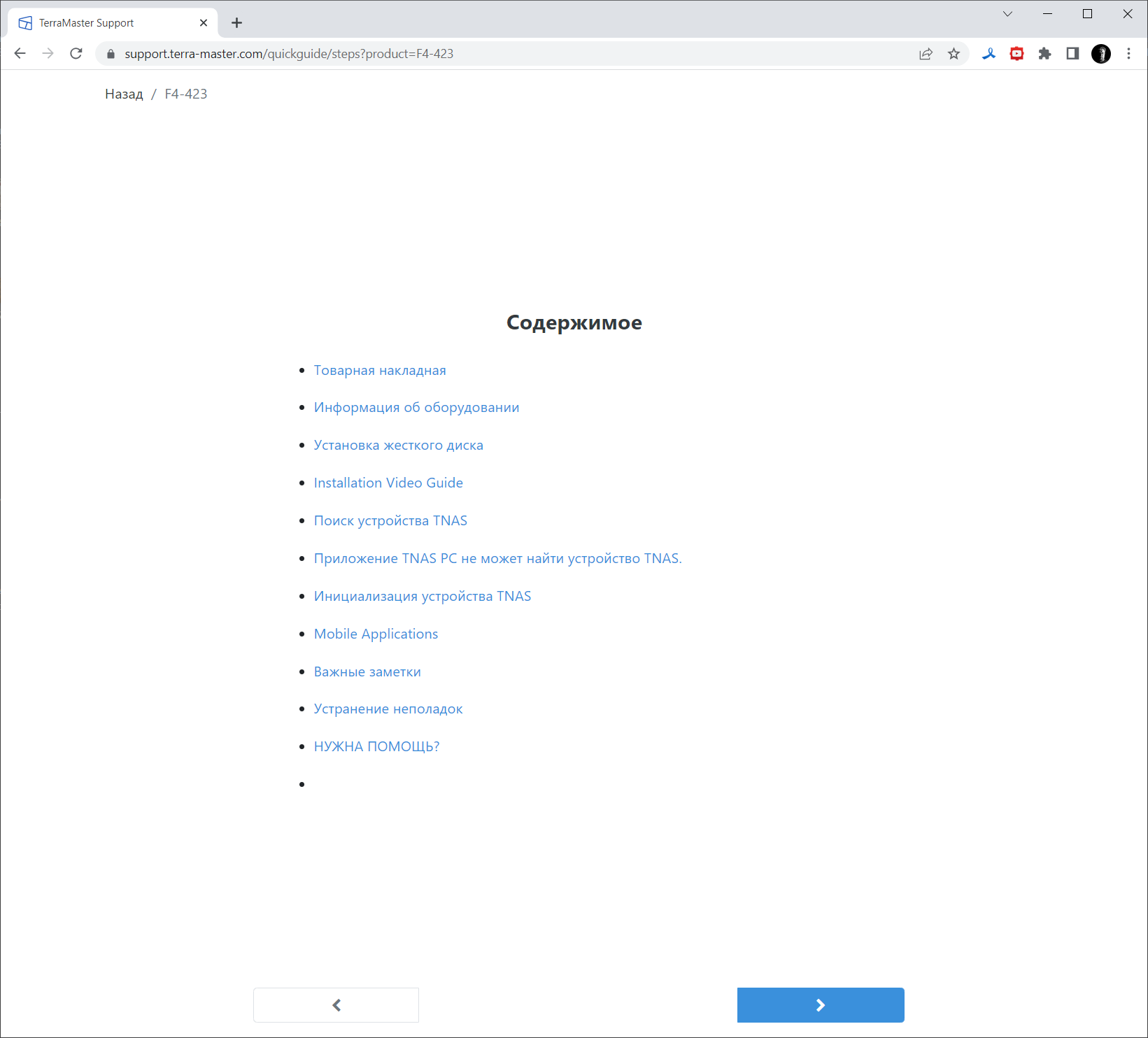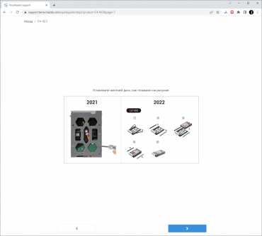 Корзины свободно вставляются в отсеки и извлекаются из них. Причем делать это в дальнейшем можно на работающем устройстве. При установке нужно следить за тем, чтобы защелки корзин погрузились заподлицо с поверхностью передней панели. Включаем питание, ждем около трех минут завершения начальной загрузки и открываем в любом браузере страницу https://support.terra-master/quickguide/. Пошаговое руководство инструктирует пользователя, как следует установить накопители.