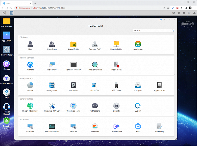 Открываем в браузере панель веб-администратора, которая у Terramaster носит название TOS Desktop.