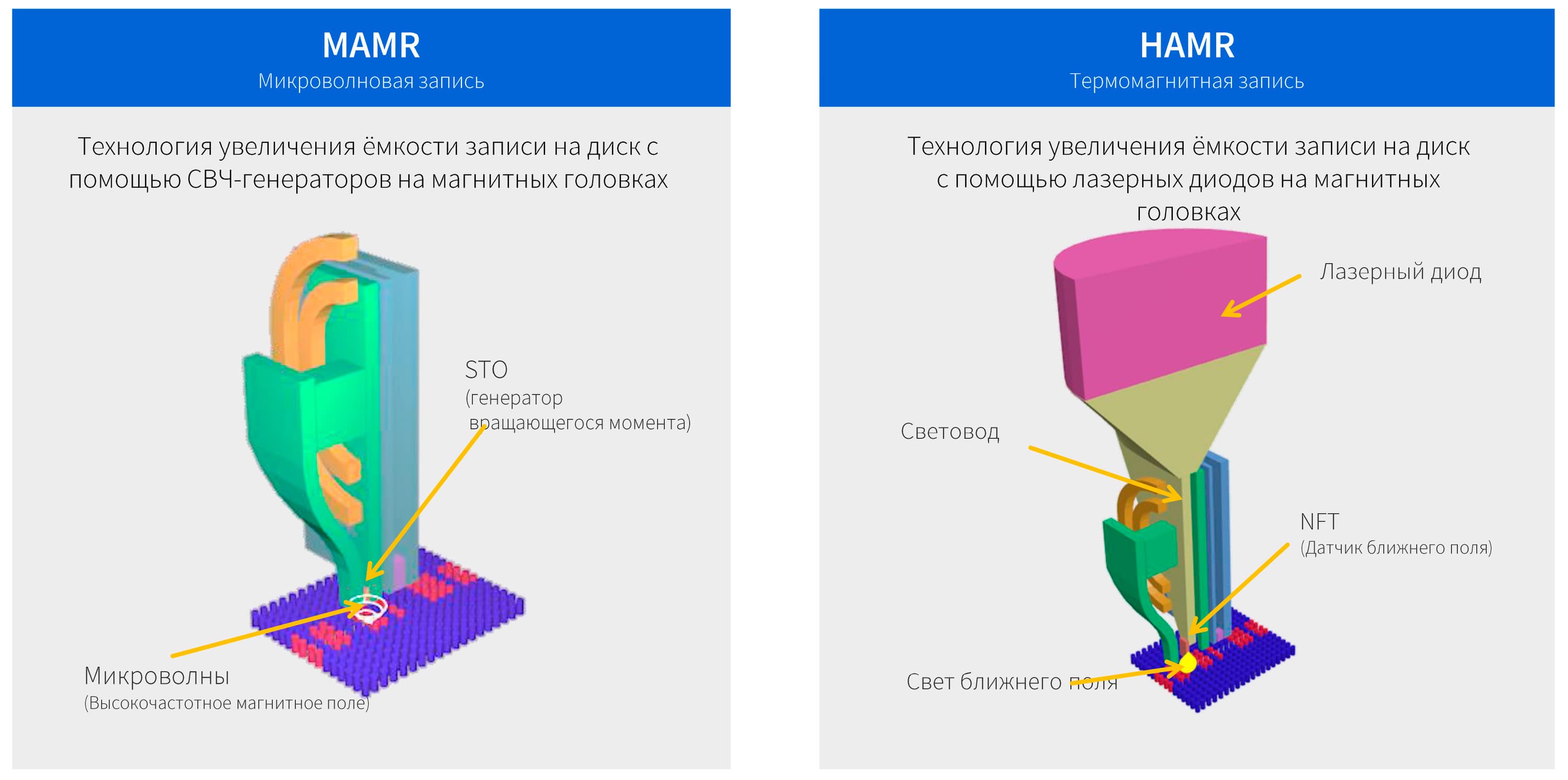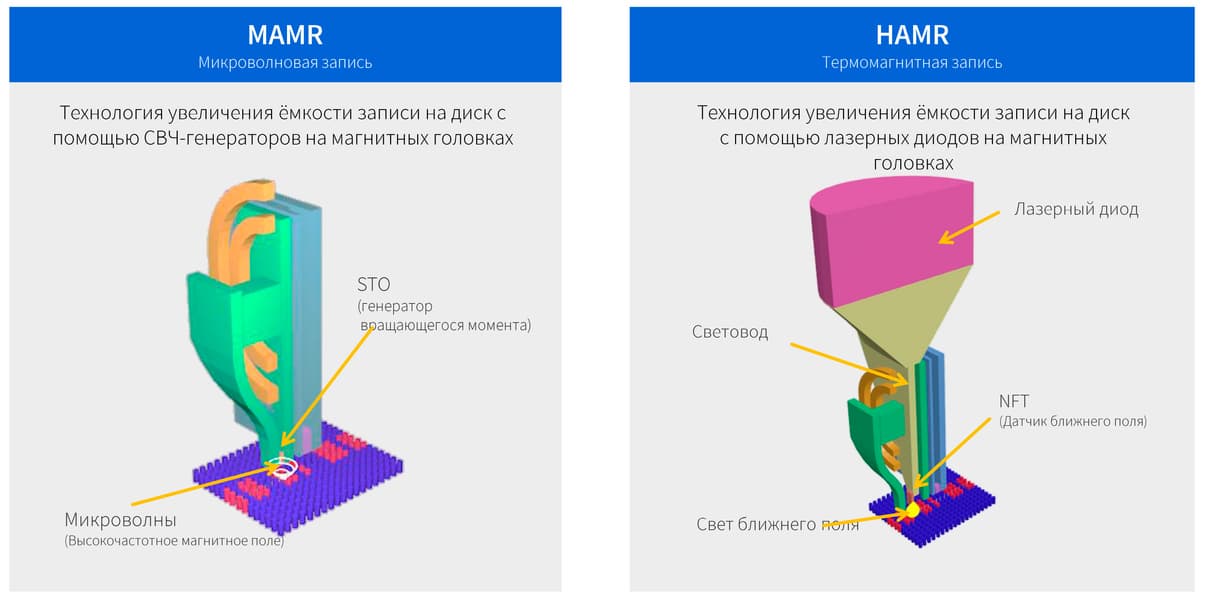В общем-то, «наследники» перпендикулярной записи определены уже давно и тестируются в лабораториях. Наиболее вероятных варианта два — либо микроволновая запись (MAMR), либо нагрев поверхности при помощи лазера для снижения сопротивления намагниченности (HAMR).