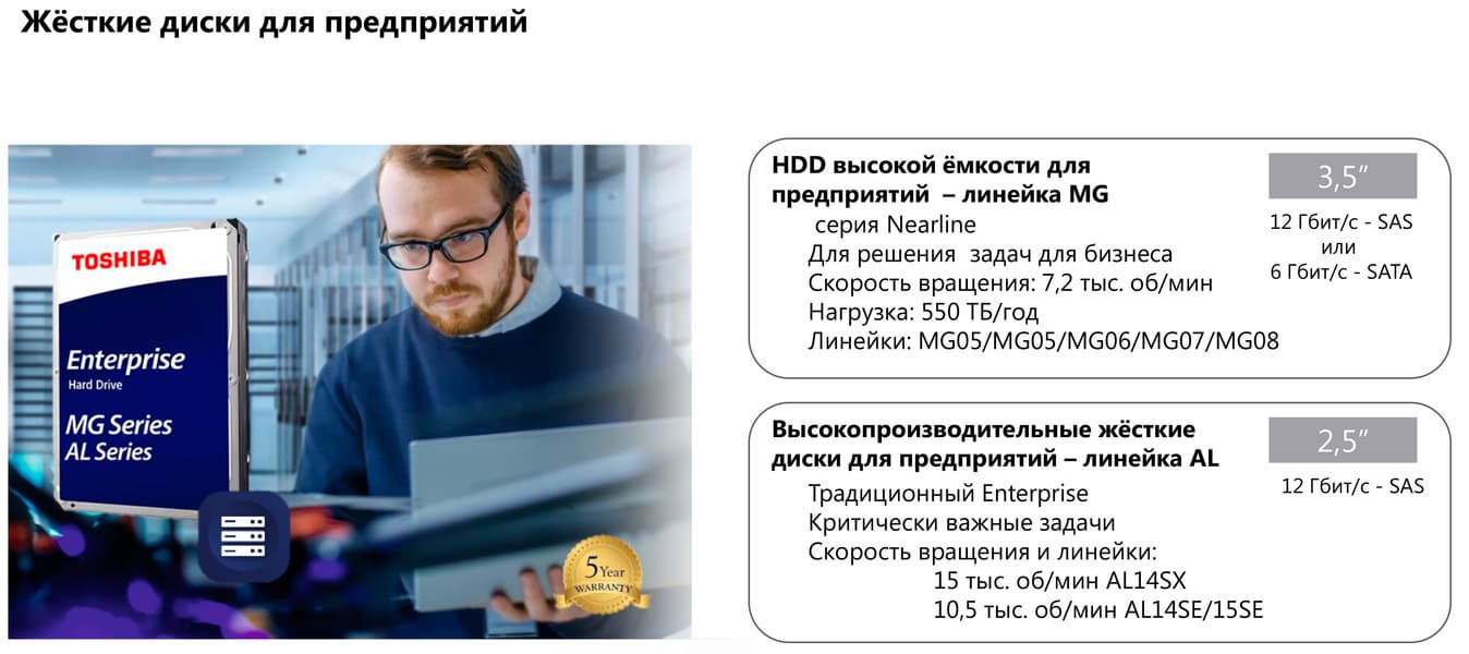 А вот диски «для предприятий», вообще говоря, сильно изменились. И с точки зрения любителей ТТХ — не в лучшую сторону (в определенной степени). Поскольку когда-то казалось, что основными трендами тут будут не только увеличение плотности (и емкости, соответственно) пластин, но и постоянное увеличение скорости их вращения, что благотворно сказывается на производительности. А также — прилагающееся к этому освоение новых интерфейсов, более быстрых и «заточенных» под потребности сегмента высокой производительности. На практике же этот тренд сошел на нет давно. Поставки дисков на 10К/15К все еще продолжаются, но и Toshiba, и другие производители дальнейшей разработкой подобных моделей уже не занимаются — основным драйвером корпоративного сегмента стали nearline-винчестеры. А вот они уже некоторыми техническими параметрами напоминают «обычные бытовые» модели. Действительно: 3,5″, 7200 об/мин, SATA-интерфейс. Никаких отличий. Но это объясняется очень просто.