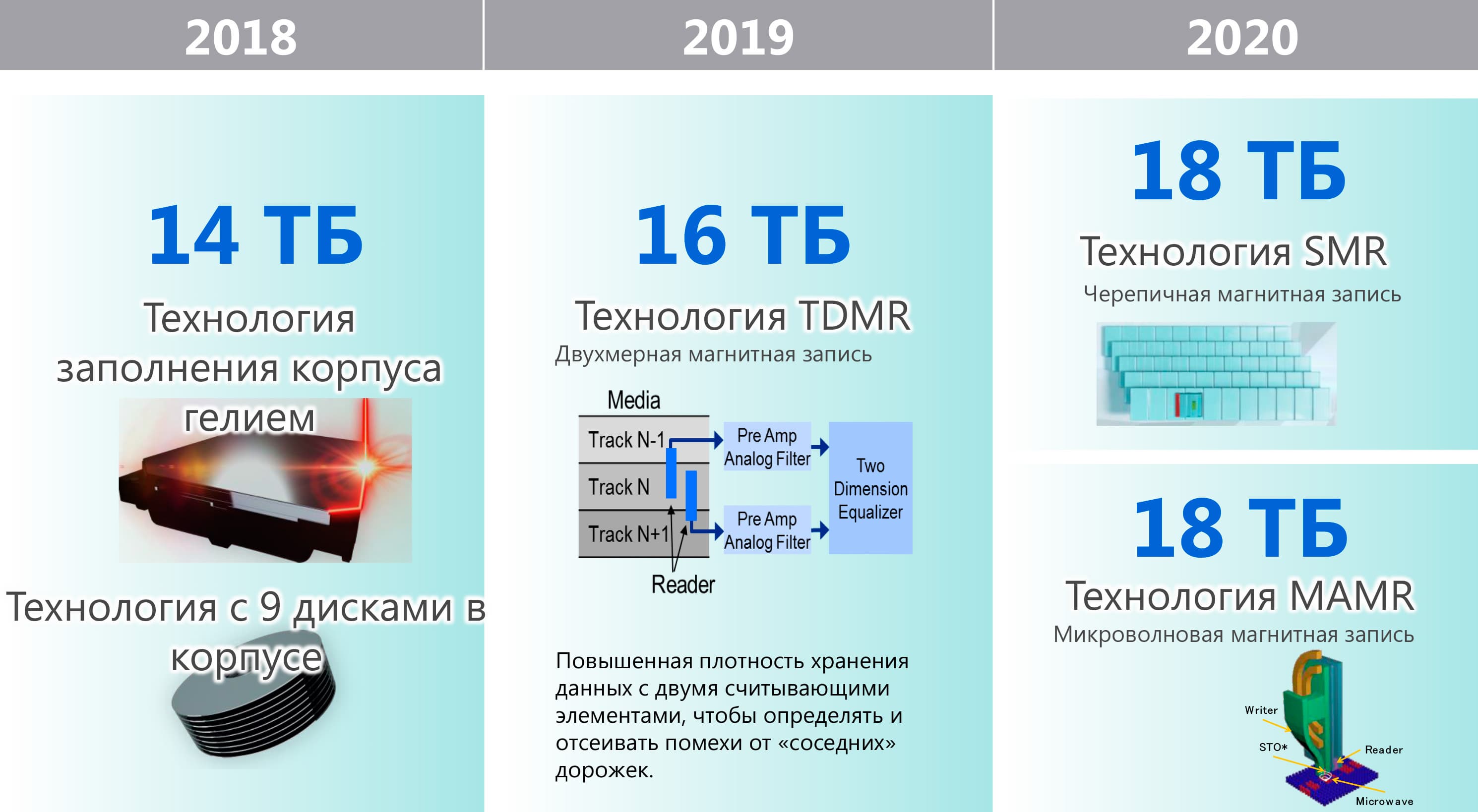 Но в первую очередь, естественно, интересно не это, а штурм новых вершин — что требует и освоения новых технологий. Как видим, запас прочности «традиционного» PMR уже исчерпан — независимо от «присадок». Девять пластин и гелий позволили Toshiba «взять» 14 ТБ, для получения в одном устройстве 16 ТБ потребовались TDMR-головки, а дальше... Всё. У конкурентов, кстати, также — Seagate, например TDMR внедрил уже на отметке 14 ТБ, но при восьми пластинах, так что в 16 ТБ пришлось тоже использовать девять: в итоге Toshiba MG08 и Seagate Exos X16 технологически очень схожи. Чтобы выйти на 18 ТБ придется либо использовать технологию «черепичной записи» (что устраивает далеко не всех клиентов), либо... в корне менять подход.
