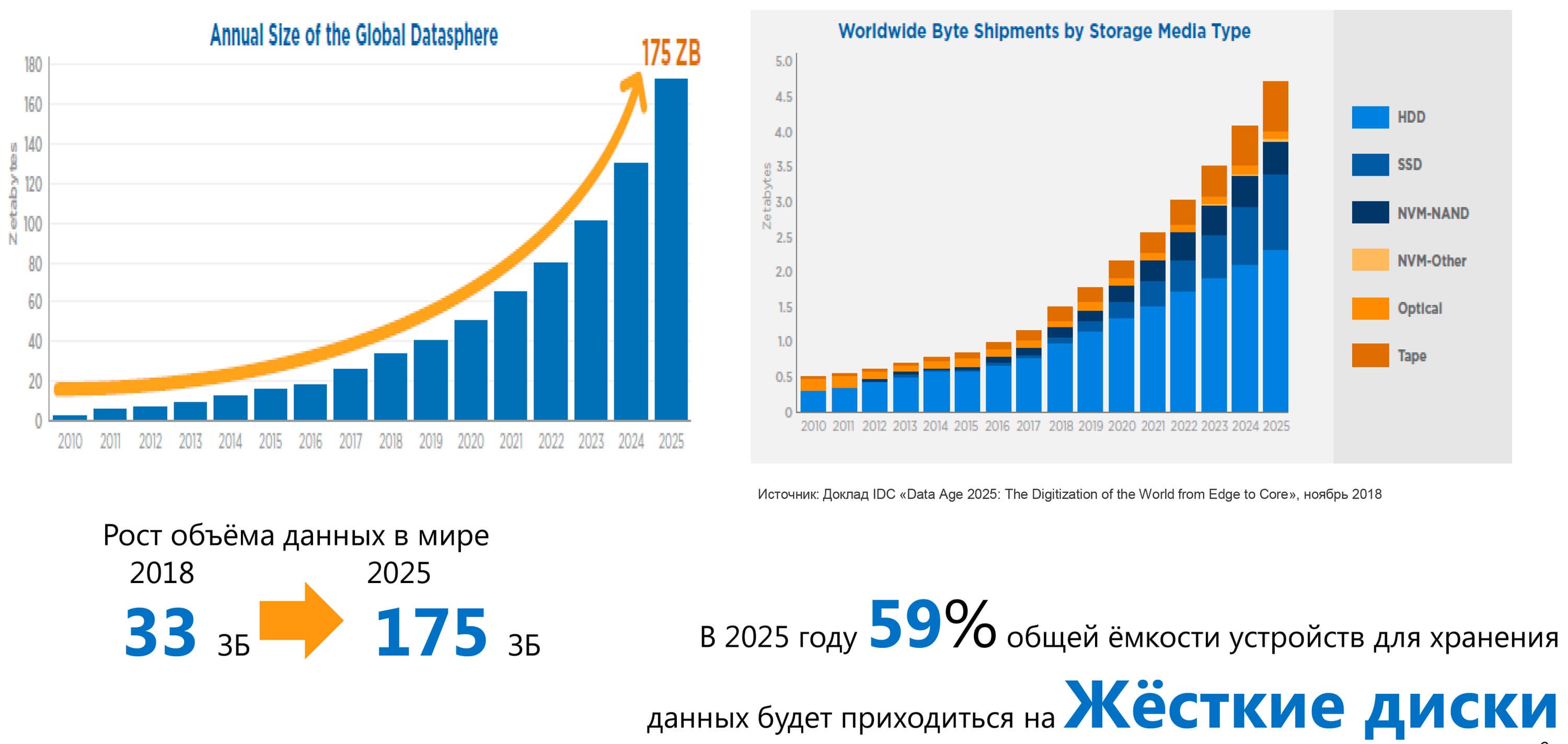 Так уж получается, что объем хранимых и обрабатываемых данных в современном мире постоянно растет — и по мнению многих аналитиков, продолжит расти по экспоненте. А в таких условиях расти «в емкостях» придется всем технологиям хранения данных. Кроме, разве что, оптики — но с ней все понятно: после перехода к цифровой дистрибуции продажи «штамповки» начали «осыпаться» куда более быстрыми темпами, чем у винчестеров, а библиотеки на записываемых оптических дисках слишком уж специфичны, чтоб стать массовым решением. Самый бурный рост, естественно, продемонстрируют твердотельные накопители (где через пять лет одних лишь устройств на отличных от NAND-флэш типов памяти будет продаваться больше, чем пять лет назад любых SSD), но одни они с увеличением потребностей рынка просто не справятся. Поэтому SSD продолжат в первую очередь использоваться в областях, где нужны высокие скорости. А «холодные» данные можно складывать и на более дешевые устройства — которыми по-прежнему будут оставаться винчестеры. Так что этому сегменту тоже, конечно, придется расти. Причем обратим внимание — именно не в «штуках» и не в «долларах», а в «гигабайтах».