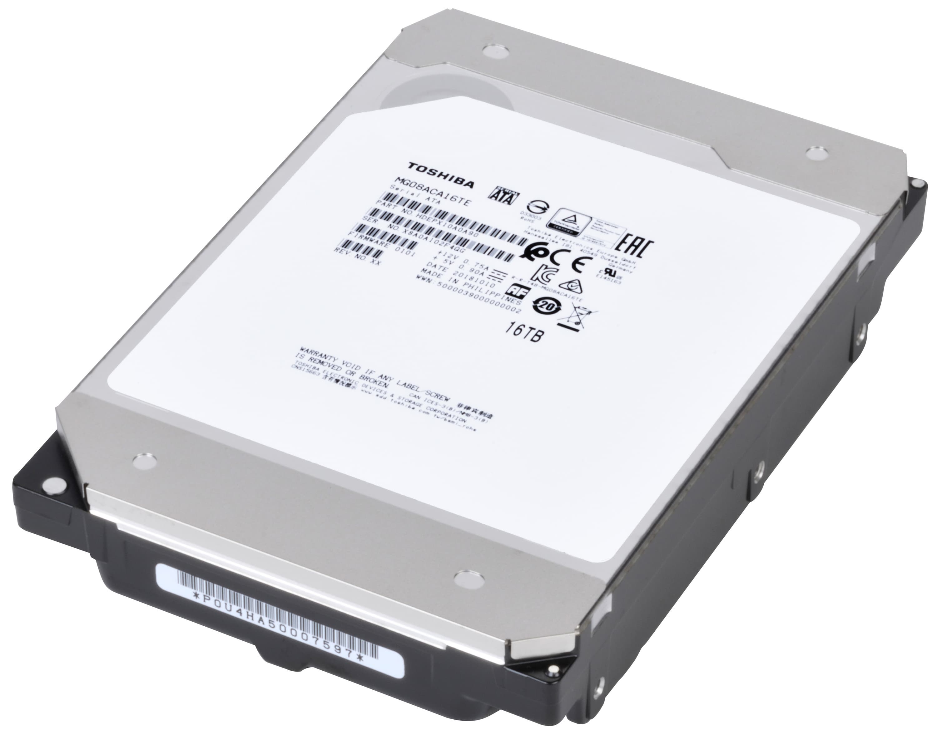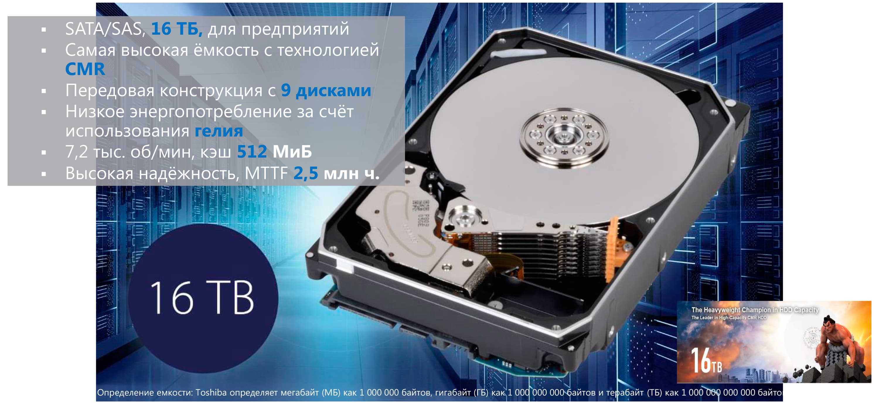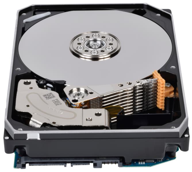 Поэтому и все новинки появляются в нем, а позднее — «переползают» в совместимые. Так было с предыдущими моделями семейства MG — так будет и с MG08. Но пока на этой платформе есть одна модель и именно для корпоративного сегмента. На данный момент максимальной емкости из всех. В принципе, за прошедшее с момента анонса время подобное появилось и у других производителей, но первой 16 ТБ освоила Toshiba, благо первой начала использовать дизайн с девятью пластинами. В итоге и 14 ГБ без SMR тоже освоила в свое время первой (в MG07), причем в отличие от Seagate и Western Digital на том этапе компании не пришлось использовать даже технологию двухмерной магнитной записи (TDMR) — но в MG08 для взятия новой вершины она потребовалась. И емкость каждой пластины теперь доведена до 1,78 ТБ — против 1,5 ТБ в дисках на 14 ТБ.