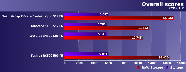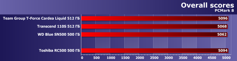 Как мы уже не раз отмечали, даже бюджетные SSD с точки зрения тестов высокого уровня не являются «узким местом» в системе. Соответственно, преимущества «небюджетных» уже не слишком-то различимы даже вооруженным глазом. Toshiba RC500 своему позиционированию во всяком случае соответствует — больше тут и сказать-то нечего.