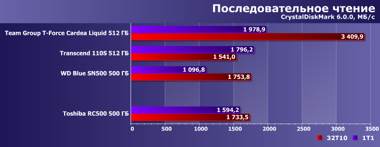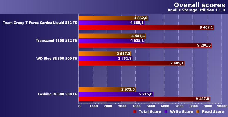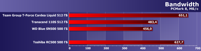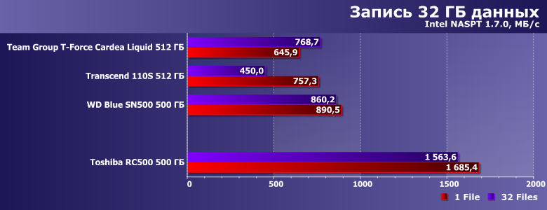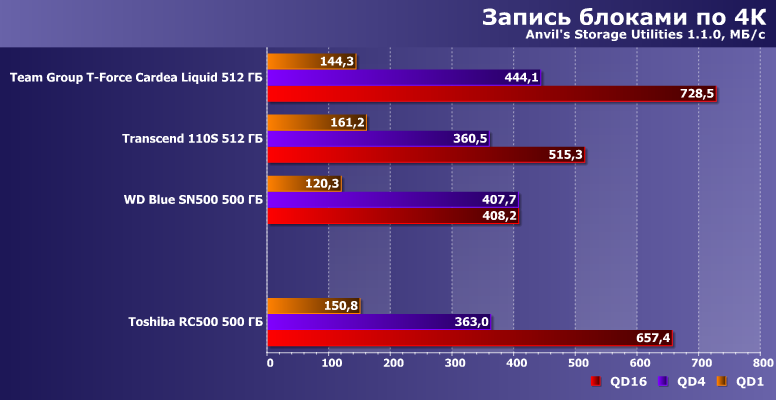 При записи же все еще хуже — тут и сама скорость взаимодействия с памятью может ограничить итоговую производительность. Во всяком случае, если выбирается устройство, емкостью 500 ГБ или менее — для этого сегмента «уберконтроллеры» не нужны. И Toshiba RC500 в итоге оказывается одним из самых быстрых из тестируемых.