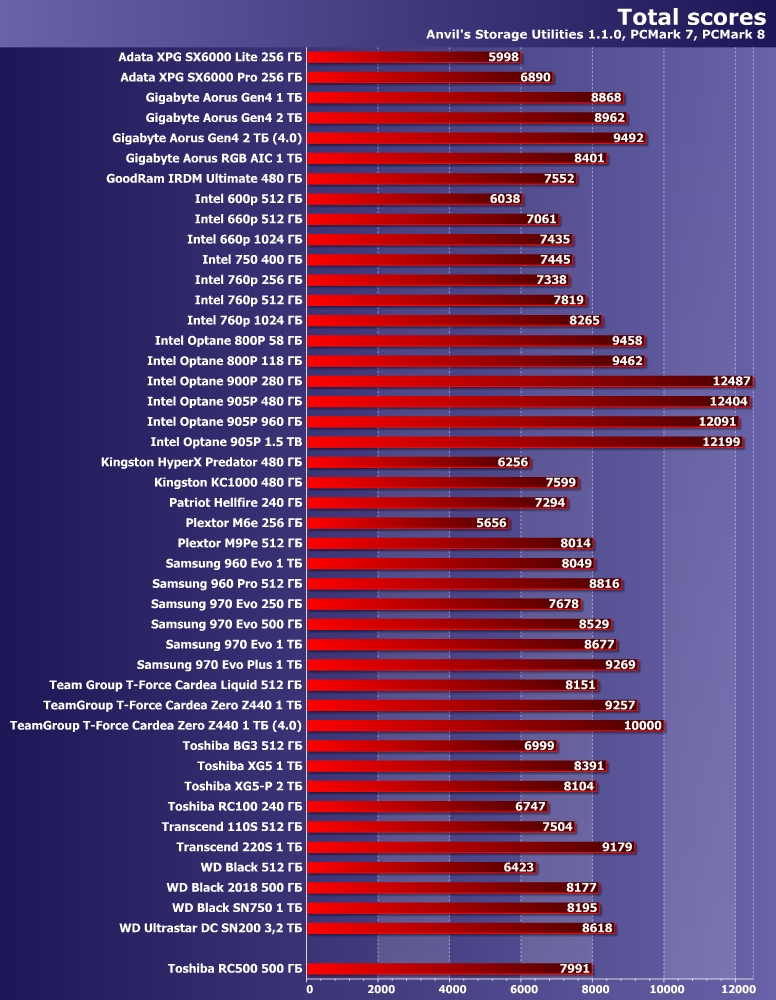 Предыдущая версия тестового пакета рапортует нам тоже самое: RC500 немного медленнее топовых накопителей и немного быстрее бюджетных. Хорошая «рабочая лошадка».