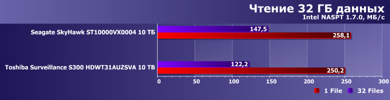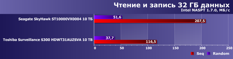 Тем более, что и результаты могут оказаться... немного неожиданными. Toshiba Surveillance S300 — современный винчестер на емких пластинах диаметром 3,5″ со скоростью вращения 7200 об/мин, но вот его производительность в качестве системного накопителя существенным образом уступает аналогичному по ТТХ Seagate SkyHawk Surveillance. А вот таковой ведет себя как раз идентично моделям Seagate для NAS и ПК, так что дело вряд ли в какой-то оптимизации прошивки. В гелии — возможно. Точнее, в работе механики, существенным образом от конкретной газовой среды, разумеется, зависящей.