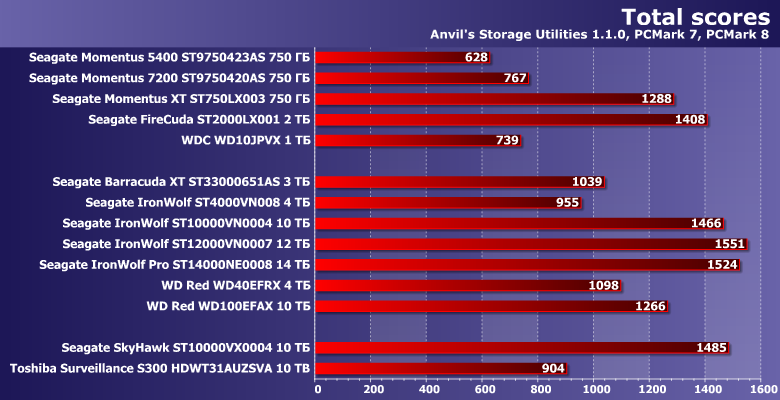 Это же можно увидеть и в объединенном рейтинге: фактически S300 опережает ноутбучные модели лишь за счет чисто последовательных нагрузок, да и то не всегда радикально. В представлениях большинства уровень «десктопной производительности» давно уже выше. Причем это не специфика целевого назначения — SkyHawk, например, практически идентичен IronWolf той же емкости. В данном случае это просто особенности конструкции — в первую очередь, механической составляющей.