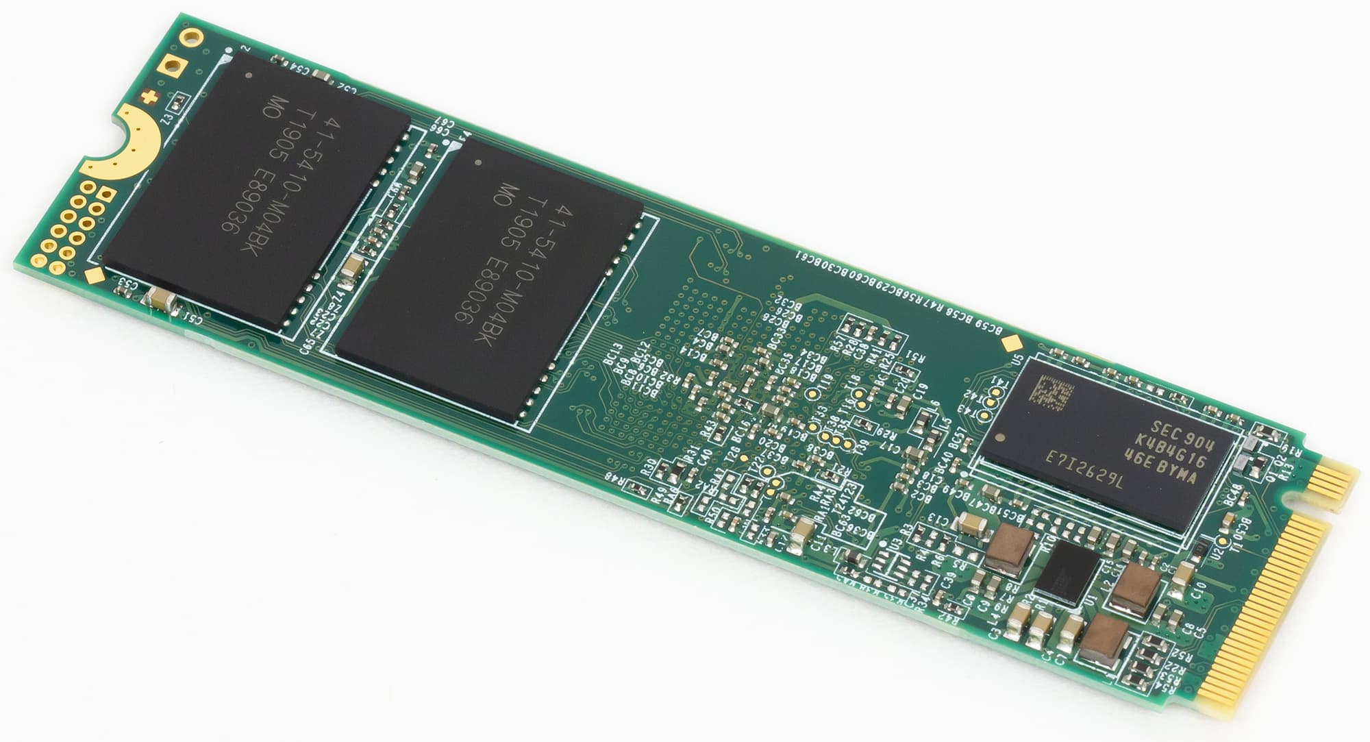 По конструкции он достаточно оригинальный. Во-первых, Transcend полагается на двухсторонний монтаж, благо ОЕМ-клиентов среди поставщиков ноутбуков у компании нет, а остальным этот вариант подходит. Зато это позволило использовать кристаллы по 256 Гбит (все той же 64-слойной памяти 3D NAND TLC IMFT) во всех моделях линейки — вплоть до 1 ТБ. Аналогичный Intel SSD 760p же «пришлось» перевести на 512 Гбит, так что он не быстрее, чем модель вдвое меньшей емкости. У Transcend такой проблемы нет: терабайтный 220S — самый быстрый в линейке. Кроме того, у него и DRAM-буфер теоретически быстрее, чем в младших моделях, где используется одна микросхема на 256 или 512 МБ (поскольку размер буфера традиционно определяется как «мегабайт на гигабайт емкости»). Здесь — две микросхемы по 512 МБ, т. е. с контроллером DRAM обменивается данными по шине шириной 32 бита, а не 16.