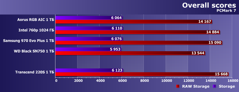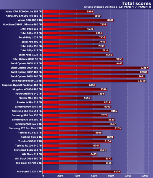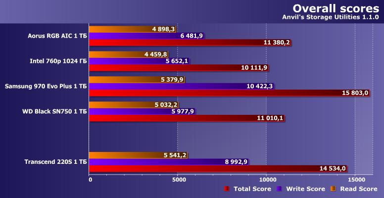 С точки зрения тестов низкого уровня, производительность Transcend 220S выше среднего при чтении данных и очень высокая при записи. От Samsung 970 Evo Plus он, конечно, отстает, но 960 Evo и даже 970 Evo обгоняет.