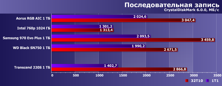 Недавно мы тестировали Aorus RGB AIC емкостью 1 ТБ. В качестве образцов для сравнения в упомянутом материале использовались Samsung V-NAND SSD 970 Evo Plus, Intel SSD 760p и WD Black SN750 аналогичной емкости. Именно эту четверку (точнее, ее результаты) мы и возьмем сегодня за образец. Благо 760р использует даже аналогичную память (хоть и с бо́льшими кристаллами при таком объеме) и почти такой же контроллер — «базовую версию» Silicon Motion SM2262, а не SM2262EN. Aorus RGB AIC — немного атипичный по исполнению представитель семейства устройств на базе Phison E12 (прямых конкурентов для моделей, основанных на SM2262/SM2262EN), но на производительности это не сказывается, а именно ее мы и сравниваем. Продукты же Samsung и WD в качестве реперных точек хороши просто сами по себе :)