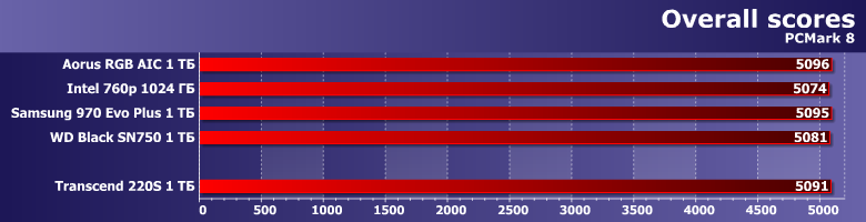 Эти результаты обычно нужны лишь «для очистки совести» — ну и проверки, что все работает «как надо». Причины озвучены неоднократно — производительность в таком сценарии использования определяется не SSD, так что все они ведут себя примерно одинаково, а если взять устройства одного класса (причем на сегодняшний день одного из самых быстрых), то и вовсе практически одинаково. Так должно быть — так и получилось.