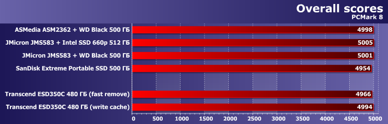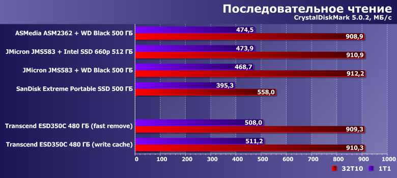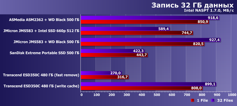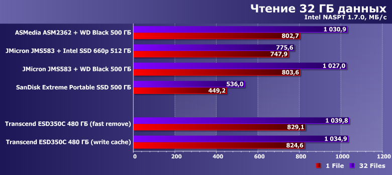 Потенциально, впрочем, использование NVMe-накопителя может оказаться более интересным, чем SATA — все в точности, как и внутри компьютера. Однако разница не так уж и велика, а среди устройств одного класса — тем более. Причем, как водится, в первую очередь производительность определяется собственно накопителем и режимом кэширования — самым быстрым оказался переделанный во внешнее исполнение Intel SSD 660p. Оптимизация же под «быстрое отключение» у Transcend ESD350C «крадет» порядка 10% потенциальной скорости — чем можно и пренебречь.
