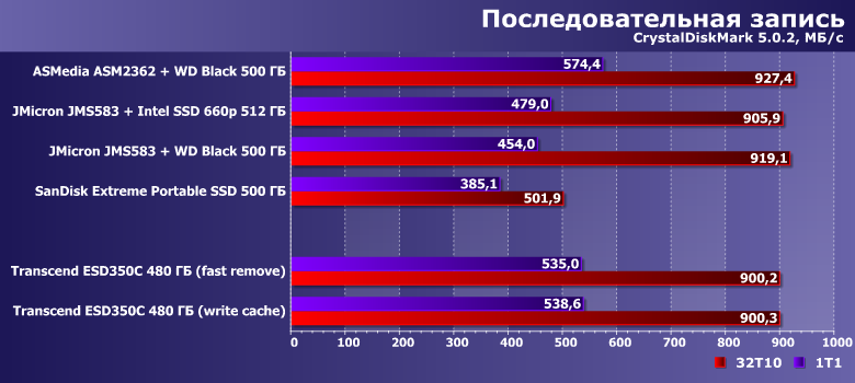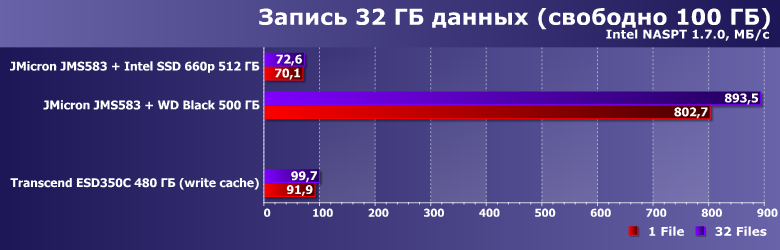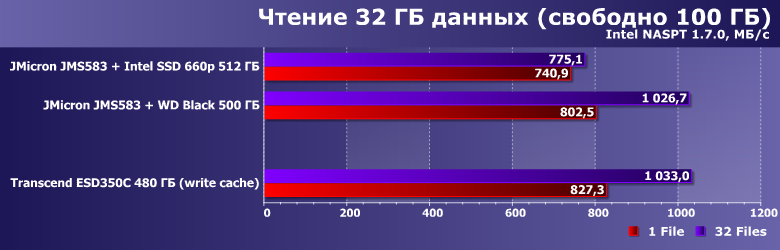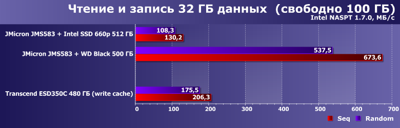 Сам же ESD350C мы тестировали как с включенным, так и с выключенным кэшированием записи. Просто потому, что последний раз сравнивали эти два режима на примере связки USB—SATA — а вдруг более быстрый вариант не так страдает от отсутствия кэширования? :) Или страдает — но размер «страдания» тоже полезно оценить. Равно как и снижение производительности на «забитом» данными устройстве: динамический SLC-кэш — это, конечно, хорошо, но несколько завышает скорости при тестировании. Поэтому тесты работы с большими файлами мы проводили как на «пустом» устройстве, так и оставив на нем свободными всего 100 ГБ, также подвергнув им и связку JMicron JMS583 с WD Black 2018 на 500 ГБ и Intel SSD 660p емкостью 512 ГБ на базе QLC-памяти, который мы добавили и к «основной» части. Последний в любом случае стоило протестировать в качестве потенциального носителя для внешнего накопителя, благо стоят представители этой линейки даже дешевле, чем «приличные» SATA-устройства такой емкости, гарантийный срок — длинный, да и быстродействие потенциально может оказаться неплохим. Но не всегда: серьезные просадки скорости записи должны быть и в этом случае. Вот и сравним их с ESD350C.