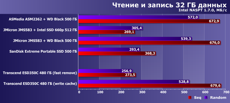 Главное, что нужно помнить — в отличие от банальных флэшек и/или внешних винчестеров, внешние SSD очень восприимчивы к кэшированию записи: без него «тормозят» все. Менять внутренний интерфейс не изменив отношение к данному вопросу, бесполезно — в лучшем случае скорость записи будет отличаться от SATA-моделей лишь на 20%. Включение же кэширования записи позволяет ускорить USB—SATA вдвое, а USB—NVMe — втрое. Так что остается только посетовать на то, что со времен Windows XP по умолчанию включен именно режим быстрого извлечения, в котором кэширование не работает. Что можно по-другому — знают не только лишь все. И не все смогут изменить настройки — особенно на чужом ПК. А делать это нужно. И чем быстрее становятся накопители — тем важнее становятся «правильные» настройки. С ними же все хорошо. Но, повторим, это скорости на практически чистом устройстве, когда в полную силу может развернуться SLC-кэширование, заодно нивелирующее разницу между QLC- и TLC-памятью. 660p, впрочем, от других участников тестирования отстает, но не принципиально. Основанные на SATA SSD устройства все равно обгоняет, а ESD350C в этом плане еще убедительнее.