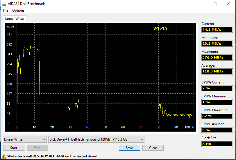 Что касается высоких скоростей, то, как и следовало ожидать в настоящее время, достигаются они при использовании технологии SLC-кэширования. «Ровной полочки» при записи не получается и в этом случае, однако скорость записи в кэш, размер которого составляет порядка 15 ГБ, превышает 350 МБ/с — из чего можно сделать вывод, что старшая (более емкая) модификация может шагнуть и за 400. Но бо́льшая часть накопителя «прописывается» данными прямо в массив TLC-флэша на скорости порядка 100 МБ/с. С одной стороны, это намного меньше обещанного, с другой — видали мы и более медленные SSD. Здесь же паритет с таковыми наступает только в самом конце диска (на последних 20%) — когда скорость падает до 50 МБ/с. В общем и целом, на запись 128 ГБ ушло около 25 минут. А теперь вспоминаем результаты некоторых внешних SSD той же компании (чтоб никому обидно не было): например, Transcend ESD240C на 480 ГБ потратил 102 минуты, т. е. результаты сопоставимы, даже если предположить независимость скорости от объема, чего на самом деле и близко не бывает.