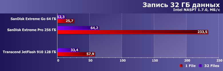 А вот с записью так не вышло. Чему еще «поспособствовала» и невысокая емкость доставшегося нам накопителя — из-за этого свободного места во время работы теста было мало, так что кэшированию негде было развернуться. С другой стороны, опять же, вспоминаем «поведение» многих внешних SSD. В частности, уже упомянутый Transcend ESD240C на 480 ГБ при наличии всего 100 ГБ свободного места записывал 32 ГБ одним файлом на скорости 80,5 МБ/с, а «более крутой» 350С той же емкости выдал в аналогичных условиях 91,9 МБ/с. А тут просто компактная (все еще) флэшка — и 57,9 МБ/с. Да, в таких условиях SanDisk Extreme Pro USB 3.1 все-таки быстрее, а часть внешних SSD еще быстрее. Но сильно критиковать нашего сегодняшнего героя мы все равно не будем. Для него это очень тяжелый сценарий — с которым, тем не менее, он относительно неплохо справляется.