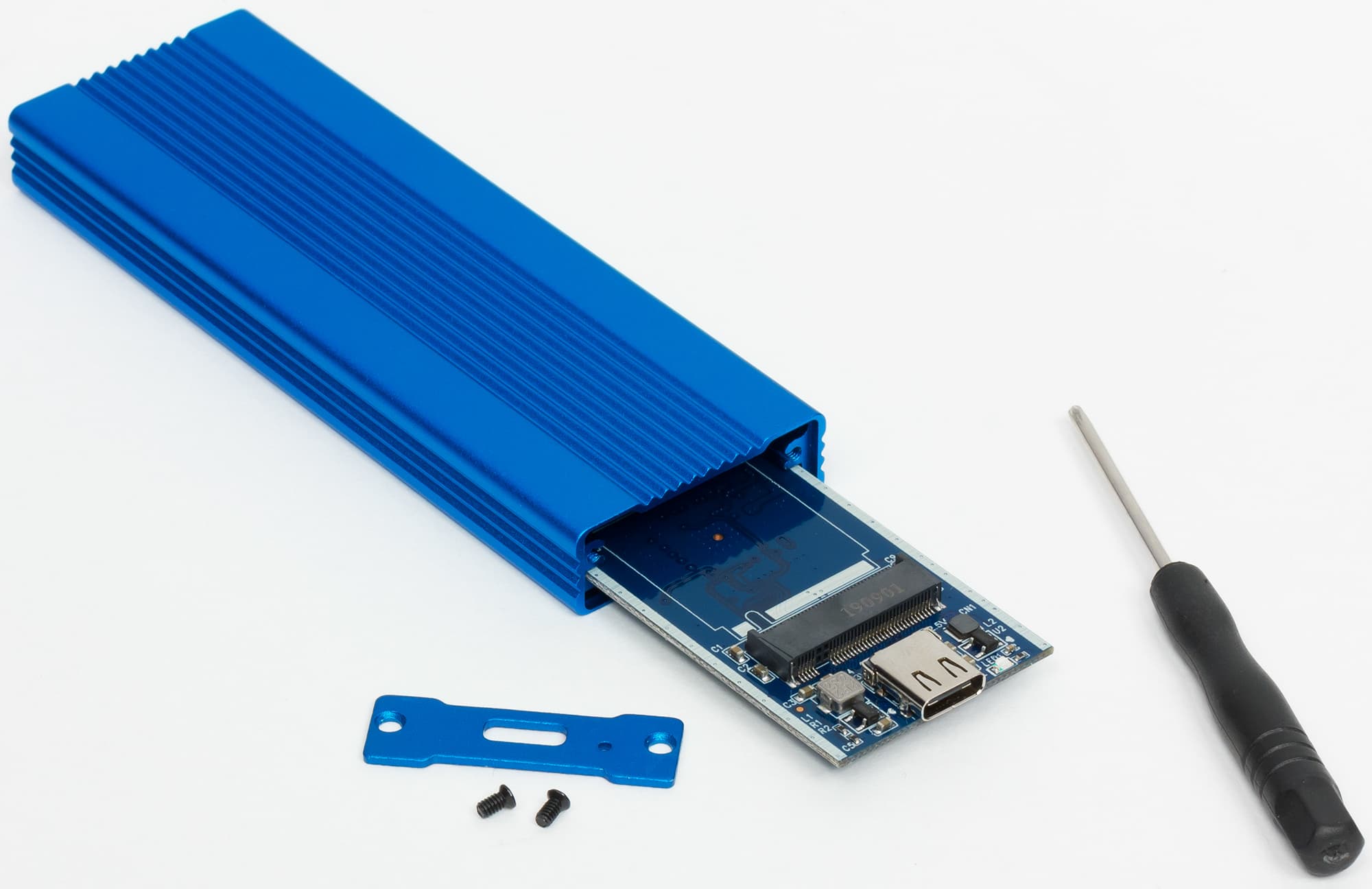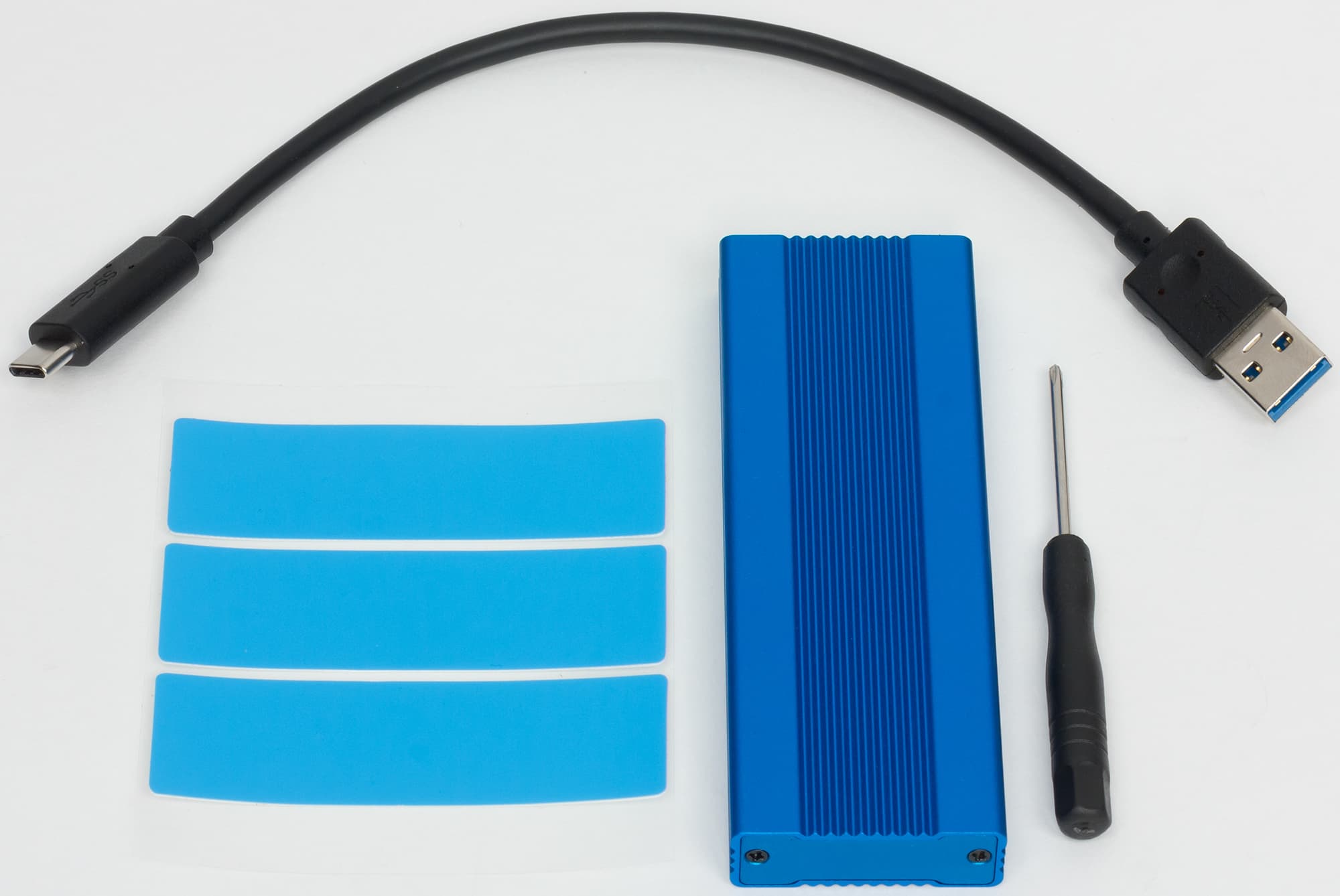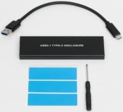 Комплект поставки в обоих случаях идентичный и трогательно-исчерпывающий: отвертка, 20 см кабель USB А—C и три теплопроводящих наклейки — поскольку многие NVMe-накопители сильно нагреваются. К сожалению, как выяснилось, ASM2362 и сам по себе тот еще горячий парень, так что об отводе тепла от него имеет смысл позаботиться всегда, когда потребности выходят за рамки простого копирования десятка-другого гигабайтов файлов. JMS583 в работе куда холоднее (вот оно — потенциальное обоснование более высокой цены :)).