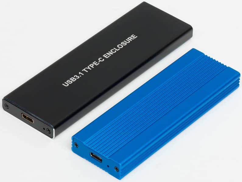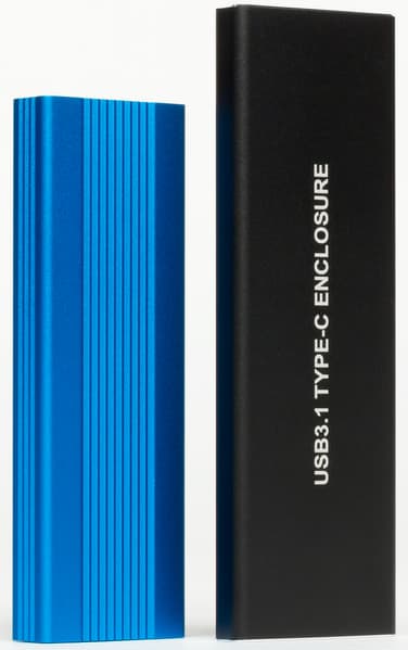 Устройства выглядят как братья (пусть и не близнецы): солидный брусок из анодированного алюминия с закрепленными болтиками торцевыми крышечками. Коробочка на JMS583 покрупнее: 125×40×10 мм. На ASM2362 — компактнее: 105×35×12 мм.