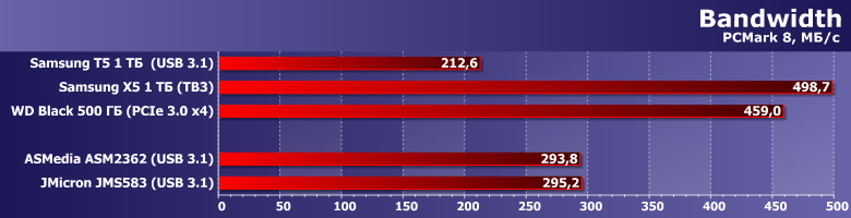 Если же убрать ограничения со стороны ПО, то, все же, не ровно — а ближе к нижнему краю. Но это просто у нас диапазон такой получился — смещенный вверх. Ниже Samsung T5 и других внешних SSD есть еще масса всяческих накопителей — вплоть до бюджетных флэшек или любых винчестеров, демонстрирующих зачастую на порядок более низкую скорость. А JMicron JMS583 и ASMedia ASM2362 позволяют получить не меньше, а заметно больше.