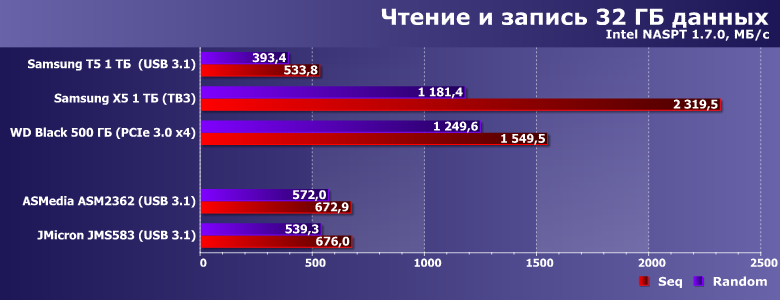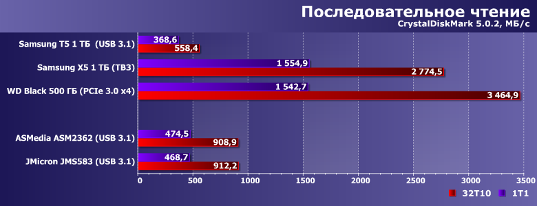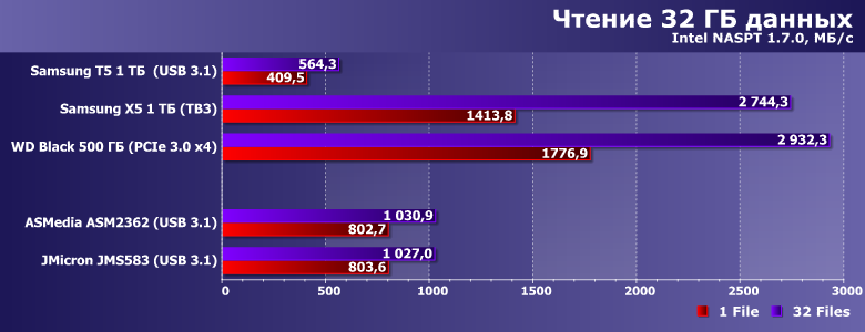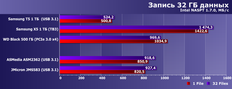 Вот так уже лучше — и больше похоже на правду. На рекорды, впрочем, не тянет — поскольку мы уже видели Thunderbolt :) С другой стороны, Х5 и среди накопителей с этим интерфейсом самый быстрый — многие как раз на ≈1 ГБ/с только и рассчитаны. А столько мы можем получить и от USB 3.1 — куда дешевле и с сохранением совместимости со старыми версиями USB. Понятно, что ценой потерь в скорости — к примеру, на порту USB 3.0 (не говоря уже о 2.0) разницы с тем же Т5 (и другими реализациями USB—SATA) не будет вовсе. Но если «под рукой» уже есть системы, где этим можно воспользоваться — можно и доплатить. Или пока не спешить, а подождать снижения цен как на сами SSD, так и (возможно) на коробочки. Главное, что способ почти удвоить производительность есть — и не только в теории.