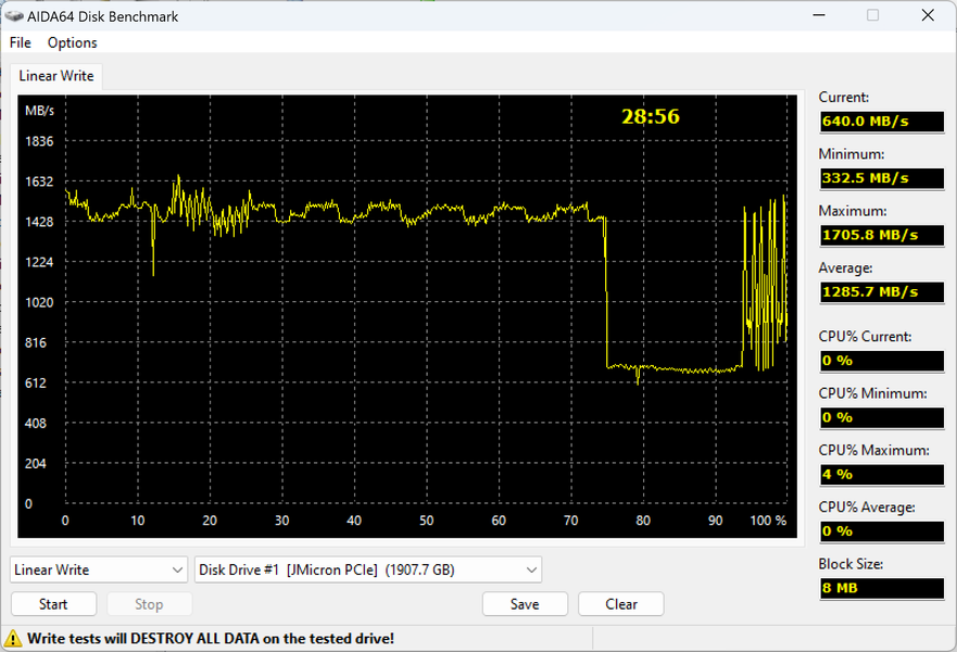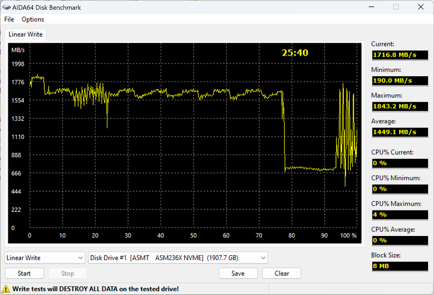 Этот участок мы наблюдаем и при использовании USB-моста ASMedia ASM2364. Работу же самого кэша увидеть почти невозможно: прямая запись достаточно быстрая, чтобы полностью освоить примерно 1,7 ГБ/с, которые Gen2×2 и обеспечивает в однопоточном режиме.
