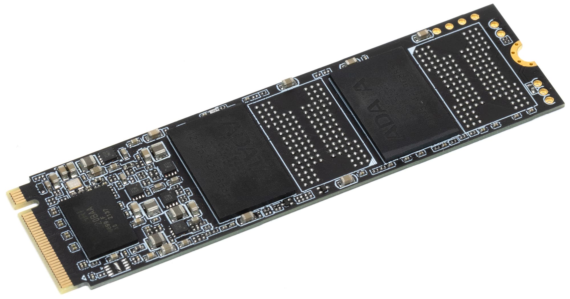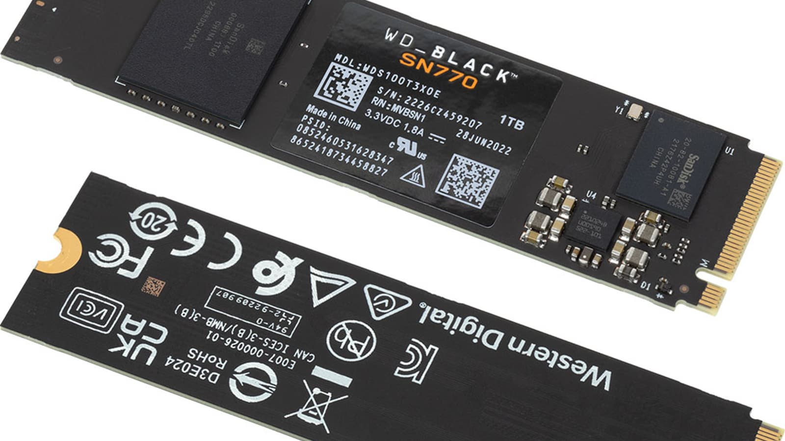 Внешне изучать даже и нечего — как мы не раз уже упоминали, большинство SSD WD выглядят своеобразно по меркам рынка, зато друг на друга похожи как две капли воды. Разве что наклейки в разных линейках разного цвета, а компоновка хоть у самых дешевых Green SN350, хоть у старших Black SN770 идентичная. Про Blue и говорить не приходится — двухчиповый (контроллер + одна микросхема флэша) подход впервые появился как раз в Blue SN500, а в SN550 обе микросхемы разнесли по разным краям платы M.2 2280 и с тех пор ничего внешне не меняется. Кроме наклеек и маркировок.
