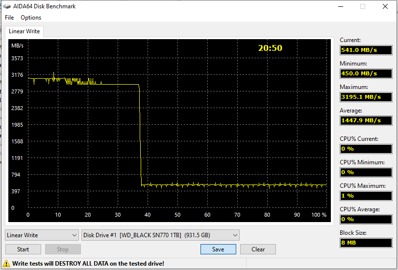 И это именно расплата за большой кэш — при втором проходе скорость только увеличивается до примерно 1,5 ГБ/с. Так что время выполнения задачи сокращается вдвое. Почему же тогда сейчас господствует подход кэш на все деньги? А потому, что писать сразу сотни гигабайт данных не приходится. Даже целую сотню, а то и две спокойно «съест» кэш — на скорости 4,5 ГБ/с. А далее SSD его спокойно расчистит при первой же паузе в работе — кои в персональном окружении составляют порядка 99% рабочего времени :) Т. е. на практике в персональном компьютере такая схема быстрее. А в серверах, где паузы в работе редки, SLC-кэширование как правило отключают полностью. Какой вариант лучше? Повторимся — зависит от конкретной нагрузки. В бытовых устройствах оптимален «спринтерский» подход, который теперь все чаще встречается и в SSD WD. И видно, что без постороннего вмешательства, SN770 «зачищает» только статическую часть кэш. Впрочем, многие и этого не делают — а тут определенный запас ячеек под быструю запись всегда найдется.