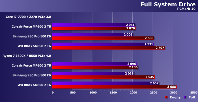 Новый комплексный PCMark 10 Full System Drive как раз ориентирован на быстрые твердотельные накопители. И включает в себя самые разные нагрузки — от запуска приложений, до простого копирования данных, так что дает полную информацию об усредненной «системной» производительностью SSD. Более подробную информацию можно получить из нашего краткого описания теста по ссылке, а сейчас — просто результаты.