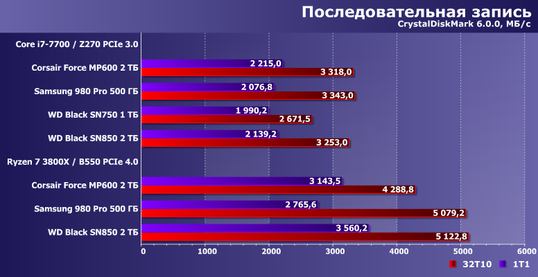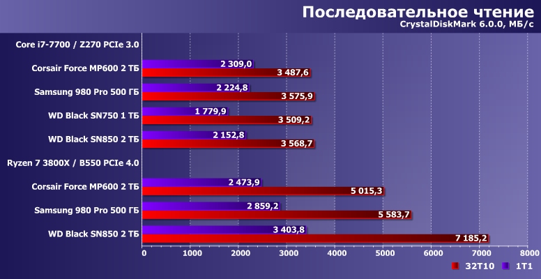 На тех же двух системах мы уже протестировали SSD разной емкости на базе Phison E16, причем у Corsair Force MP600 и емкость была как раз такой же — 2 ТБ. Его результатами и воспользуемся. Поразмыслив немного, взяли и Samsung 980 Pro — тут прямой аналогии нет, поскольку существенно различается емкость (всего 500 ГБ против 2 ТБ), но устройство все равно быстрое — быстрее, чем получались любые SSD на том же Е16. И без предшественника в виде WD Black SN750 тоже обойтись никак нельзя — пусть и тоже немного различалась емкость (но в данном случае не существенно), да и на нем мы не все актуальные тесты проводили, но сравнение необходимо хотя бы в таком виде.