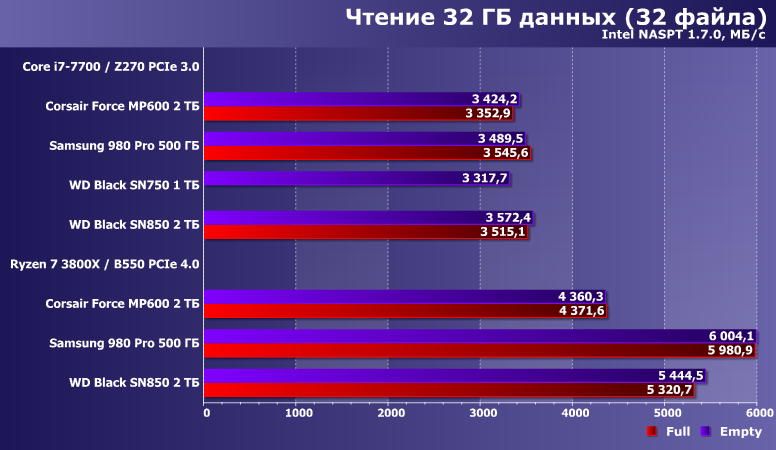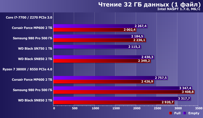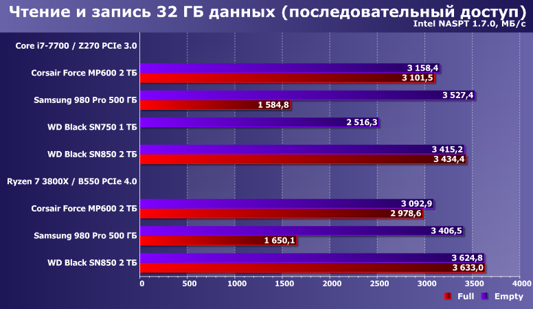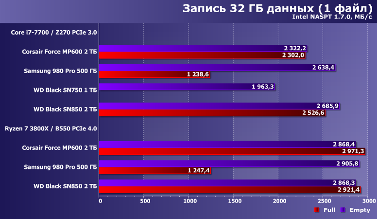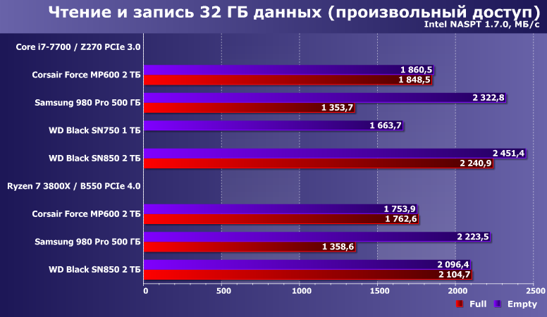 Довольно показательные. В частность Force MP600 практически все равно на какой платформе работать, что плохо — зато и все равно в каком состоянии, что, напротив, хорошо. В более свежих накопителях агрессивное кэширование достигло таких высот, что позволяет существенно увеличить производительность при запасе свободного места — с точки зрения оптимиста. Пессимист же, скорее, скажет, что такие накопители в забитом данным состоянии (что как раз является нормальным эксплуатационным) начинают «тормозить». На деле — все относительно. Samsung 980 Pro даже при недостатке места лишь незначительно уступает накопителям на Phison E16, а WD Black SN850 в худшем случае еще быстрее, чем Samsung — в лучшем. Если сравнивать устройства другой емкости, картина может и измениться, но не радикально. Принципиальна тут разница подходов: 980 Pro под кэш использует не более 20% емкости, а SN850 — чуть более 30%, так что в сопоставимых условиях «накэширует» больше и работать будет быстрее. Но даже если смотреть на худший случай только в паре «двутеров», то это новый уровень для флэша — тут-то неоднозначностей в оценках не возникает.