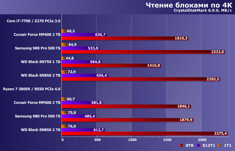 В очередной раз необходимо повторить — не отсортируй мы заранее результаты по платформам, сделать это было бы затруднительно. Факторов, влияющих на производительность в такого рода сценариях много. И особенности функционирования низкоуровневых бенчмарков на разных платформах — не последние из них. Впрочем, как и нюансы совместимости разных накопителей с разными контроллерами PCIe: как мы уже не раз видели, все совместно работают — но все немного по-разному.