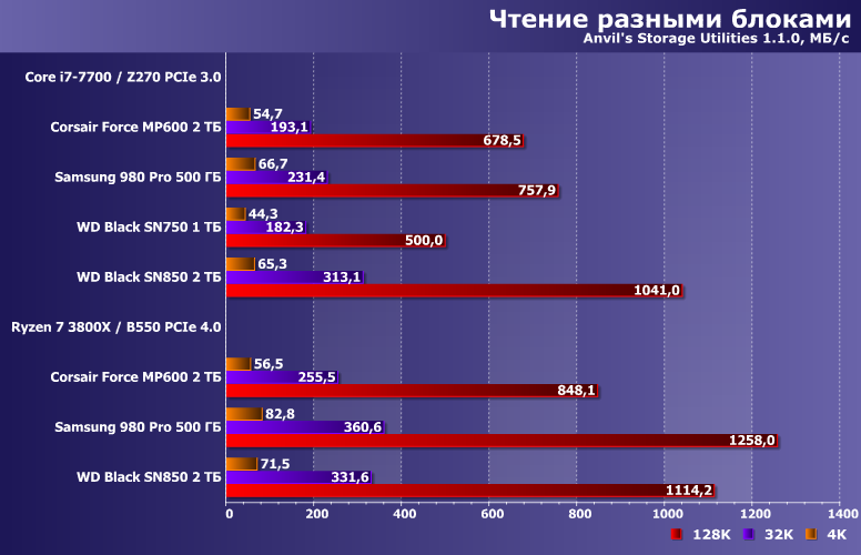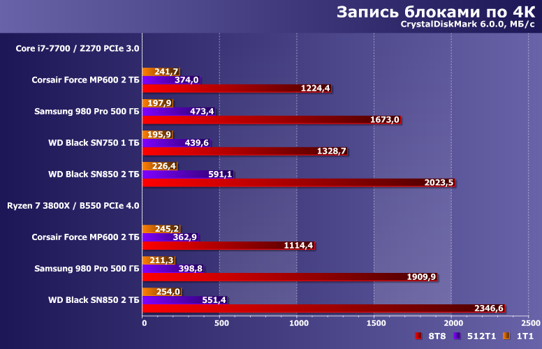 С записью же расклад понятен, если вспомнить, что при 100 ГБ свободного места у MP600 или SN850 размеры кэша может достигать и 33 ГБ, а вот у 980 Pro он при этом не превышает 20 ГБ. Если бы мы записывали 16 ГБ — все оказались бы равны. Если 40+ ГБ — то не совсем равны, но близки. А тут так вот «сыграл» выбранный объем работы.